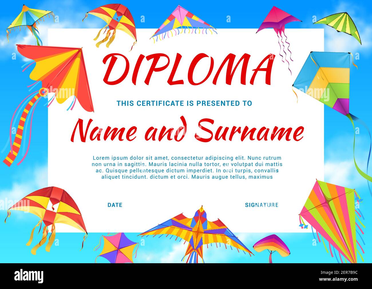 Diplôme de maternelle, certificat scolaire avec cerfs-volants de couleur. Modèle de diplôme pour enfants pour participation, remise de diplômes ou invitation de vacances Image Vectorielle Stock - Alamy