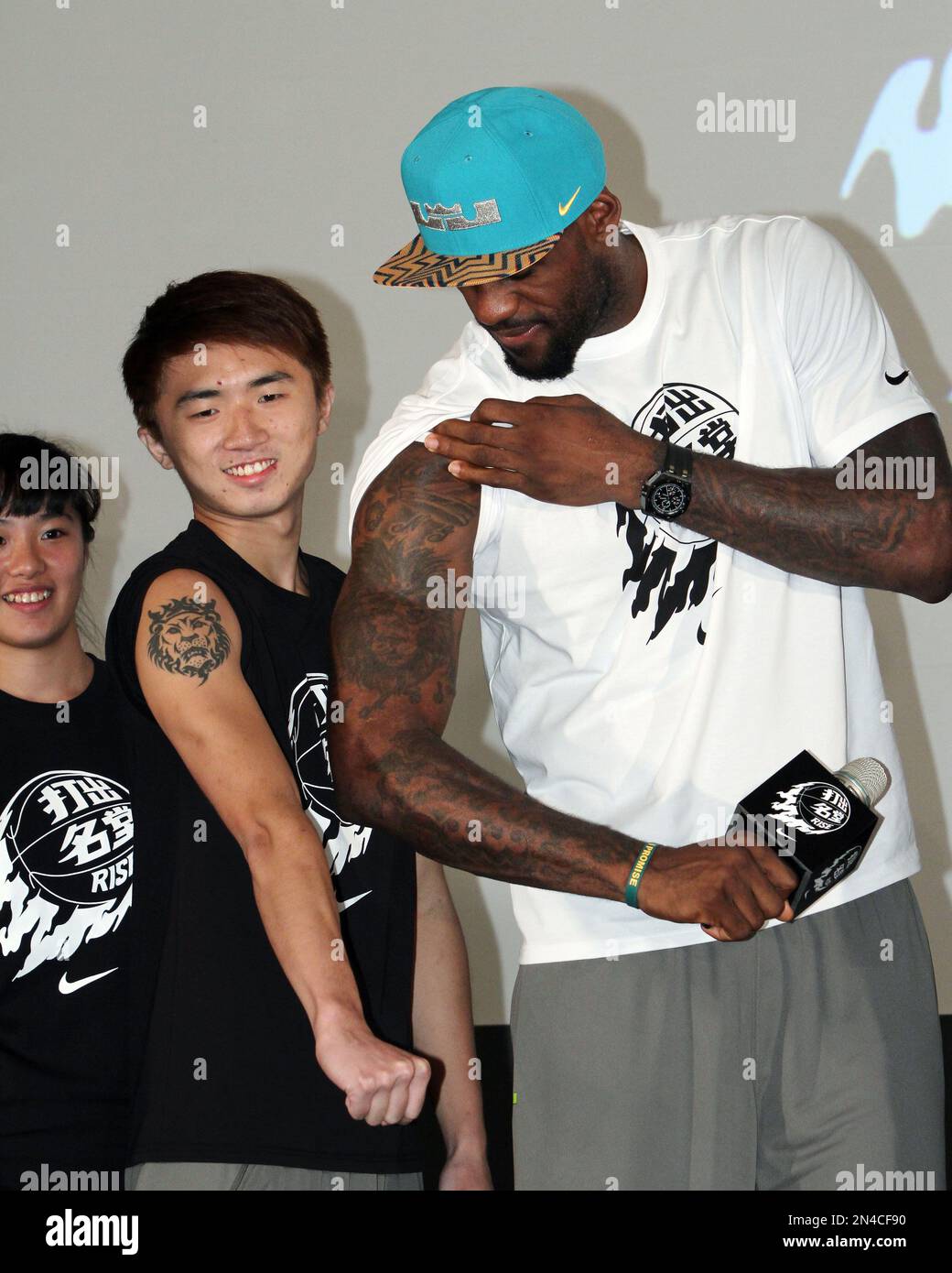 NBA Cleveland Cavaliers player LeBron James, right, shows his tattoo with one of his fans during a media event in Taipei, Taiwan, Friday, July 25, 2014. James is in Taiwan for basketball