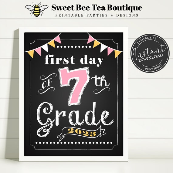 First Day of School Chalkboard Printable Sign Poster - Photo Prop - Seventh 7th Grade - Instant Download Digital File - Pink Yellow White