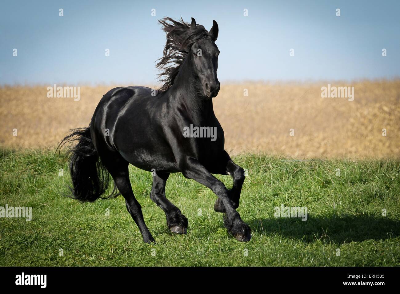 Cheval frison hongre noir de pâturage au galop Photo Stock - Alamy
