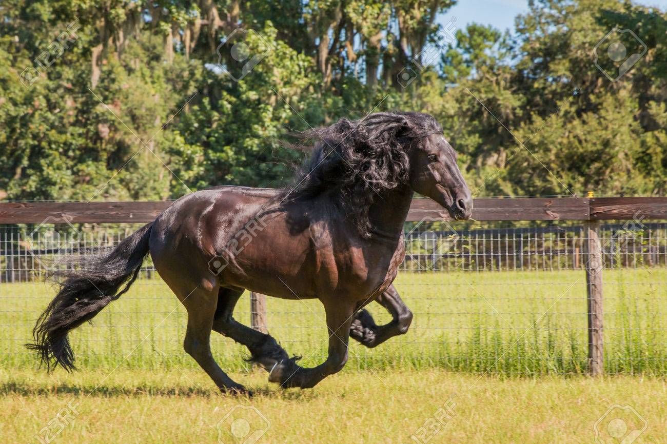 Noir Brun Cheval Étalon Frison Au Galop Galop Courir En Vert Champ D'herbe Prairie Paddock À Côté De La Clôture Banque D'Images et Photos Libres De Droits. Image 31423630