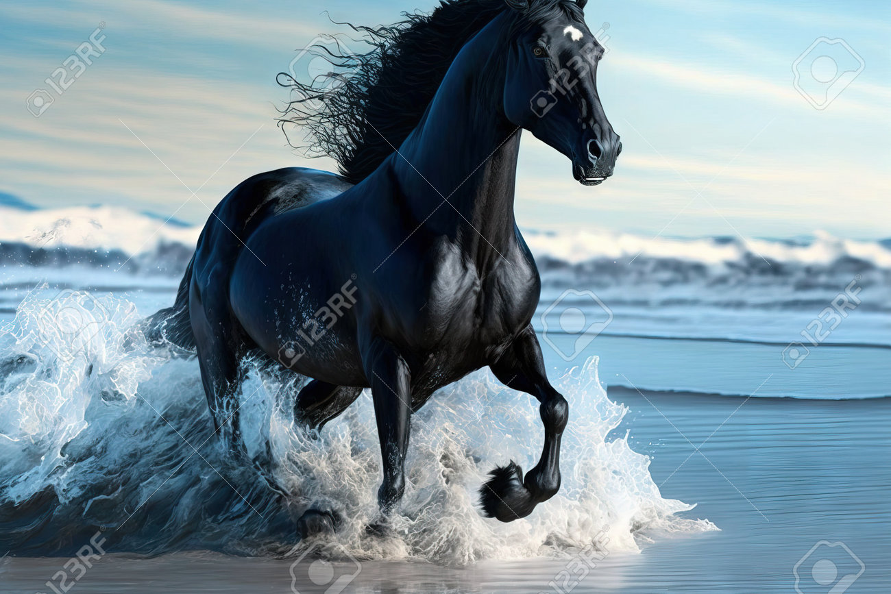 Sur La Côte, Un Cheval Frison Noir Galope Dans L'eau Banque D'Images et Photos Libres De Droits. Image 200194086