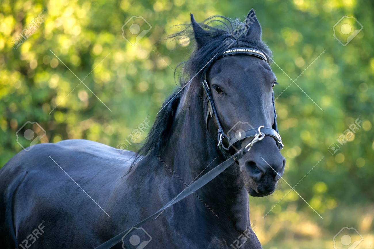 Cheval Frison Noir Court Galop En Été Banque D'Images et Photos Libres De Droits. Image 70731676