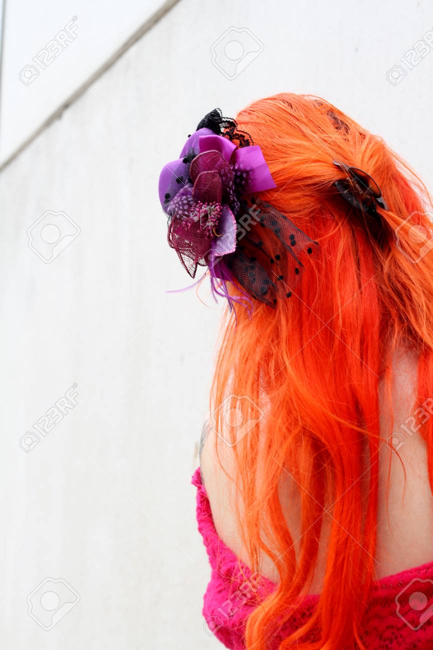 Long Cheveux Teints D'orange, Alternative Vue Modèle Dos, Accessoire De Cheveux Violet Et Épaule Off Robe Rose, Image Abstraite Banque D'Images et Photos Libres De Droits. Image 48425789