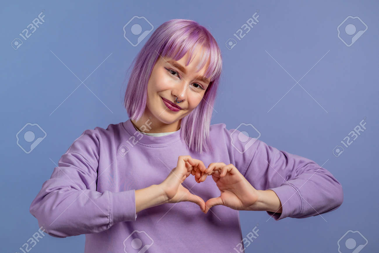 Gentille Jolie Femme Faisant Signe De Forme Coeur Près De Sa Poitrine. Cheveux Teints En Violet. Fond Violet. Santé Des Femmes, Bénévolat, Aide Aux Dons Et Concept D'amour. Banque D'Images et Photos