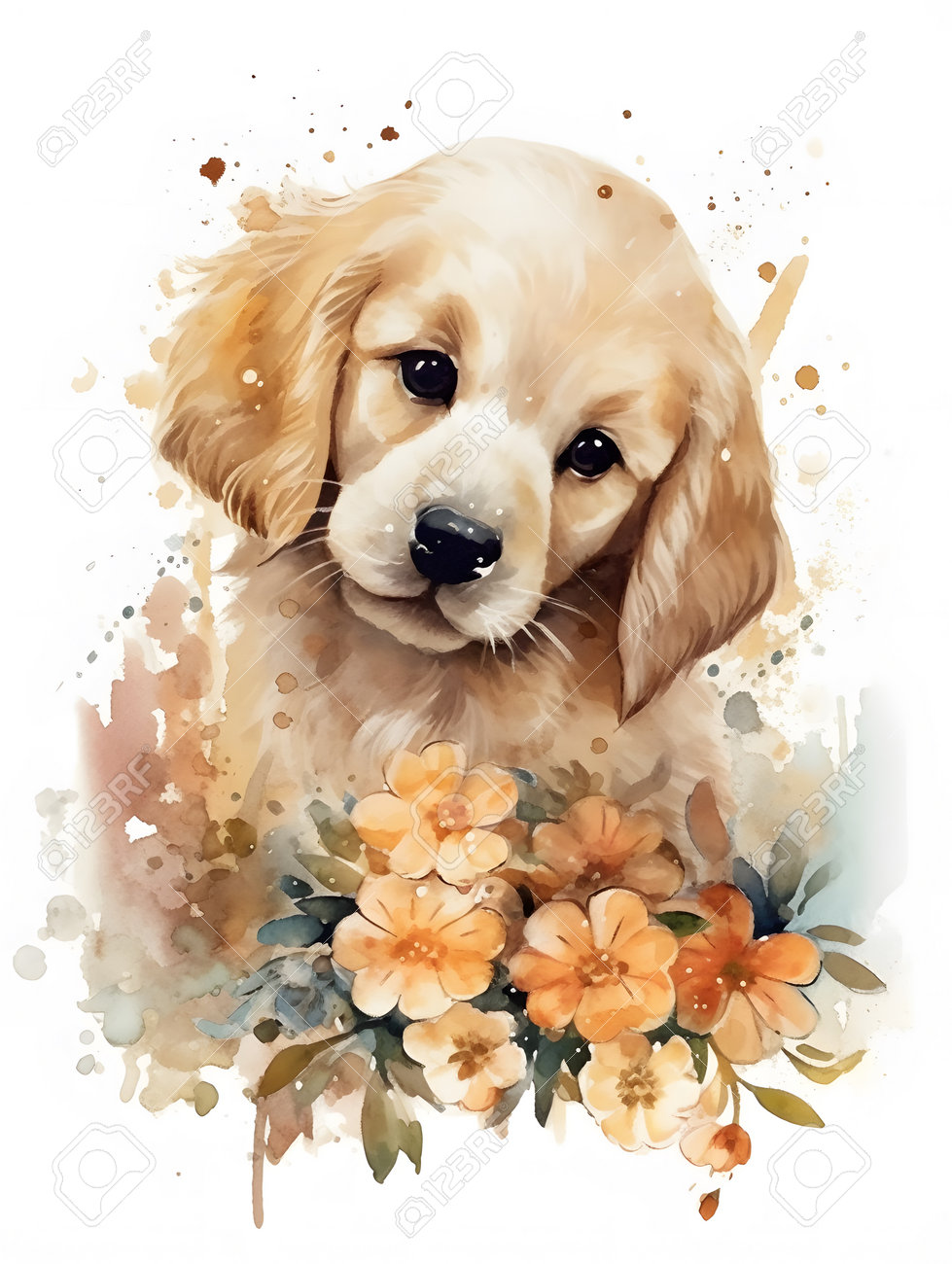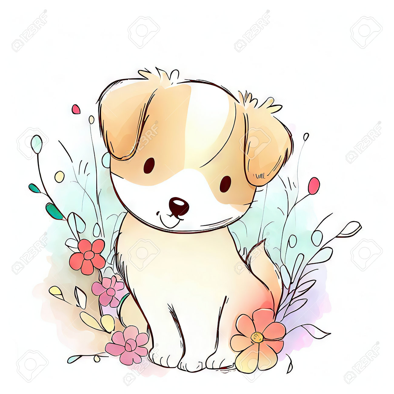Chiot Mignon Avec Des Fleurs Sur Illustration Vectorielle Fond Aquarelle Banque D'Images et Photos Libres De Droits. Image 205475456