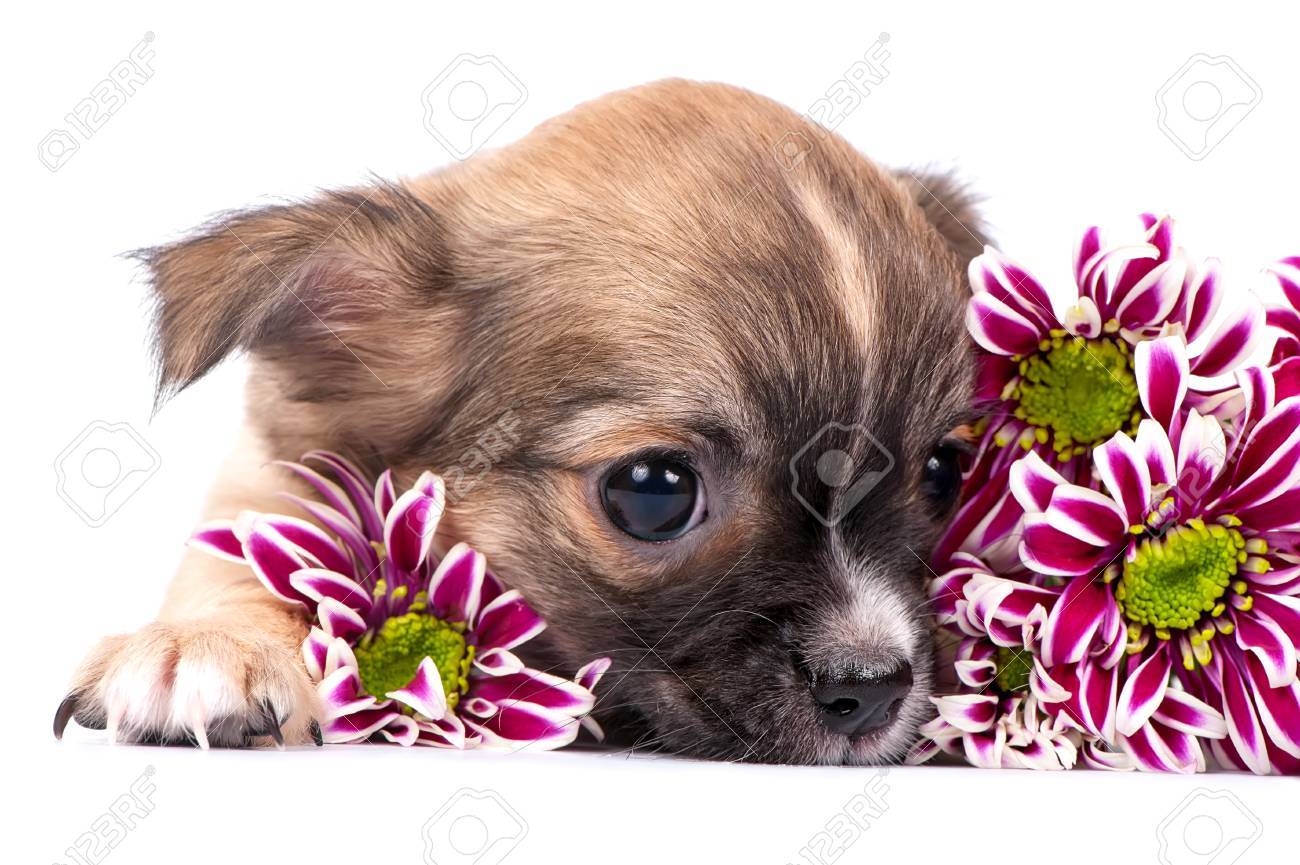 Mignon Chiot Chihuahua Avec Des Chrysanthèmes Fleurs Roses Sur Fond Blanc Banque D'Images et Photos Libres De Droits. Image 41038591