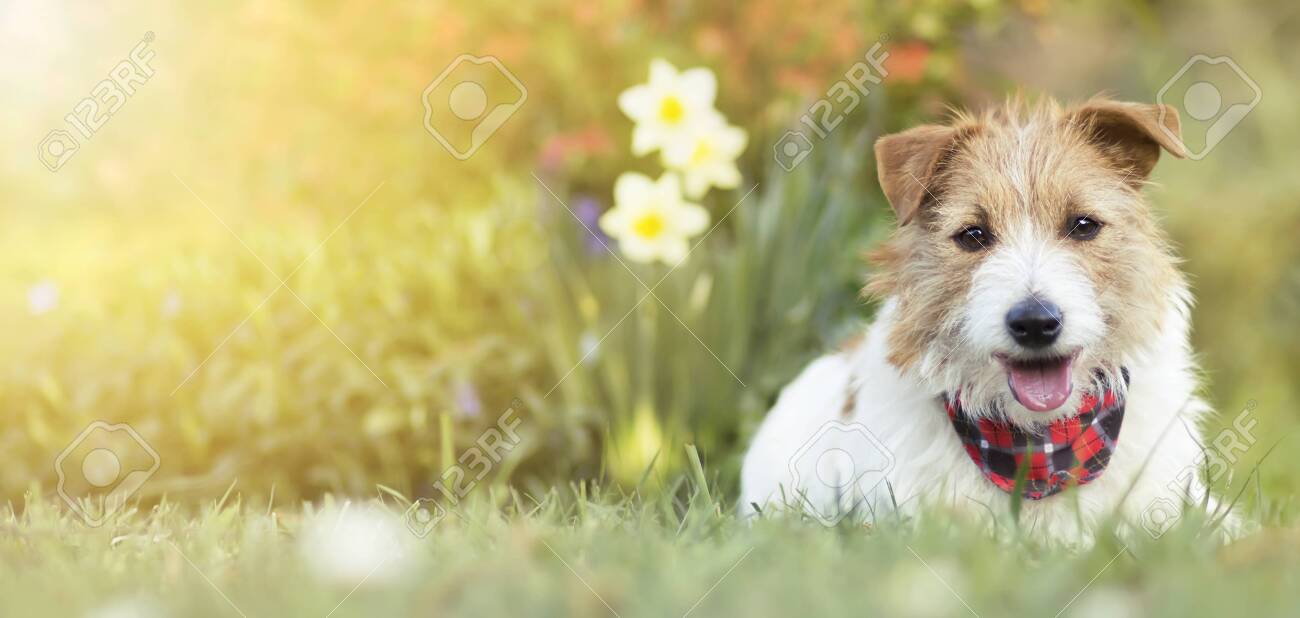 Joyeux chien mignon chiot écoutant dans le jardin avec des fleurs de jonquilles. Printemps avant, pâques arrière-plan. Chien dans la nature Photo Stock - Alamy