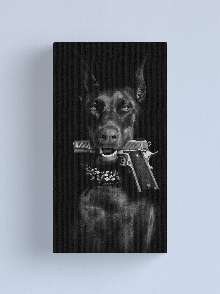 Affiche de chien DobSuffolk noir avec une arme à feu pour salon, peinture sur toile créative, art mural nordique, décor à la maison