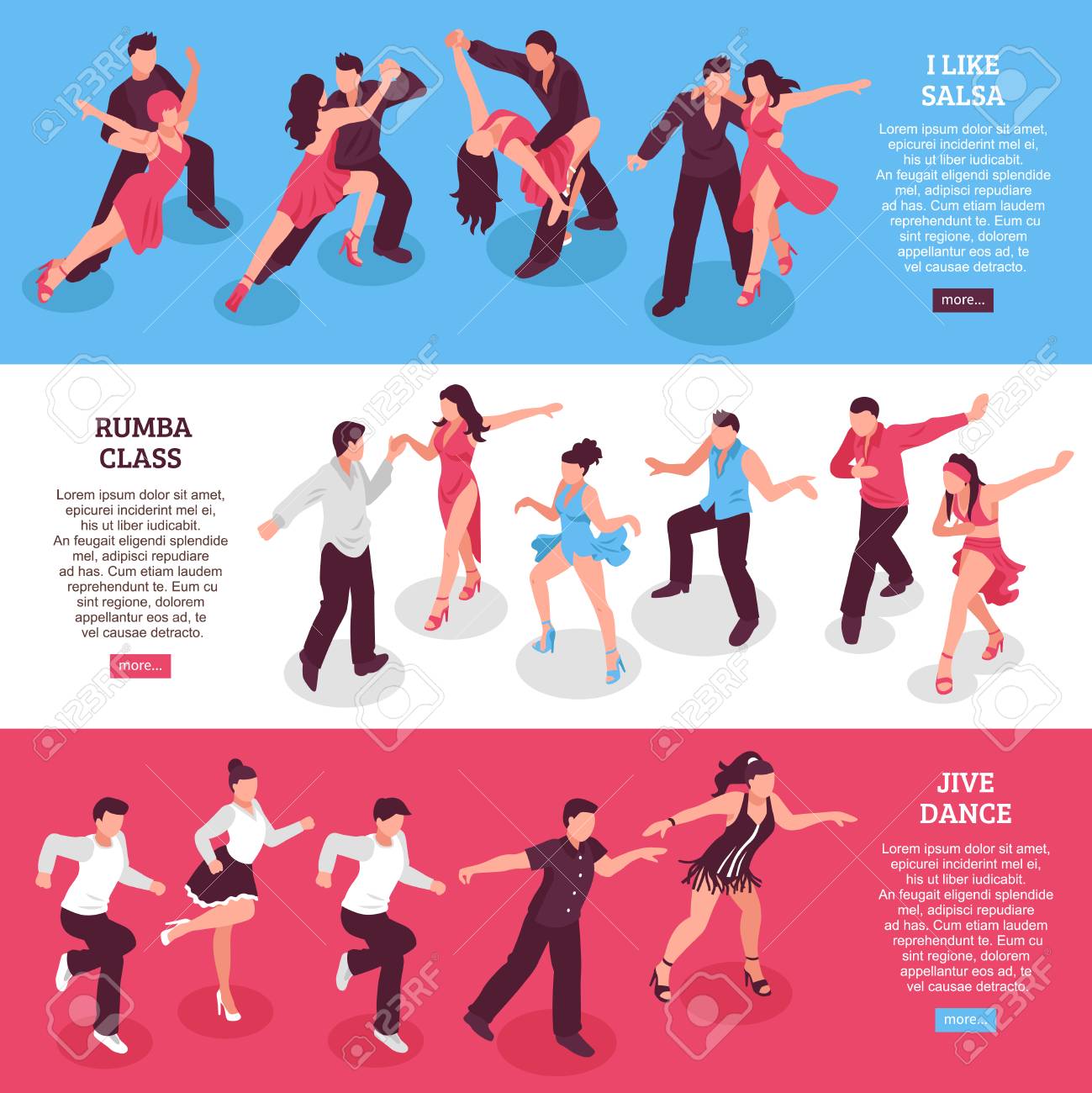 Ensemble De Danse De Bannières Isométriques Horizontales Avec Cours De Rumba, Personnes Pendant La Salsa, Illustration Vectorielle Isolée Jive Clip Art Libres De Droits, Svg, Vecteurs Et Illustration. Image 99855893