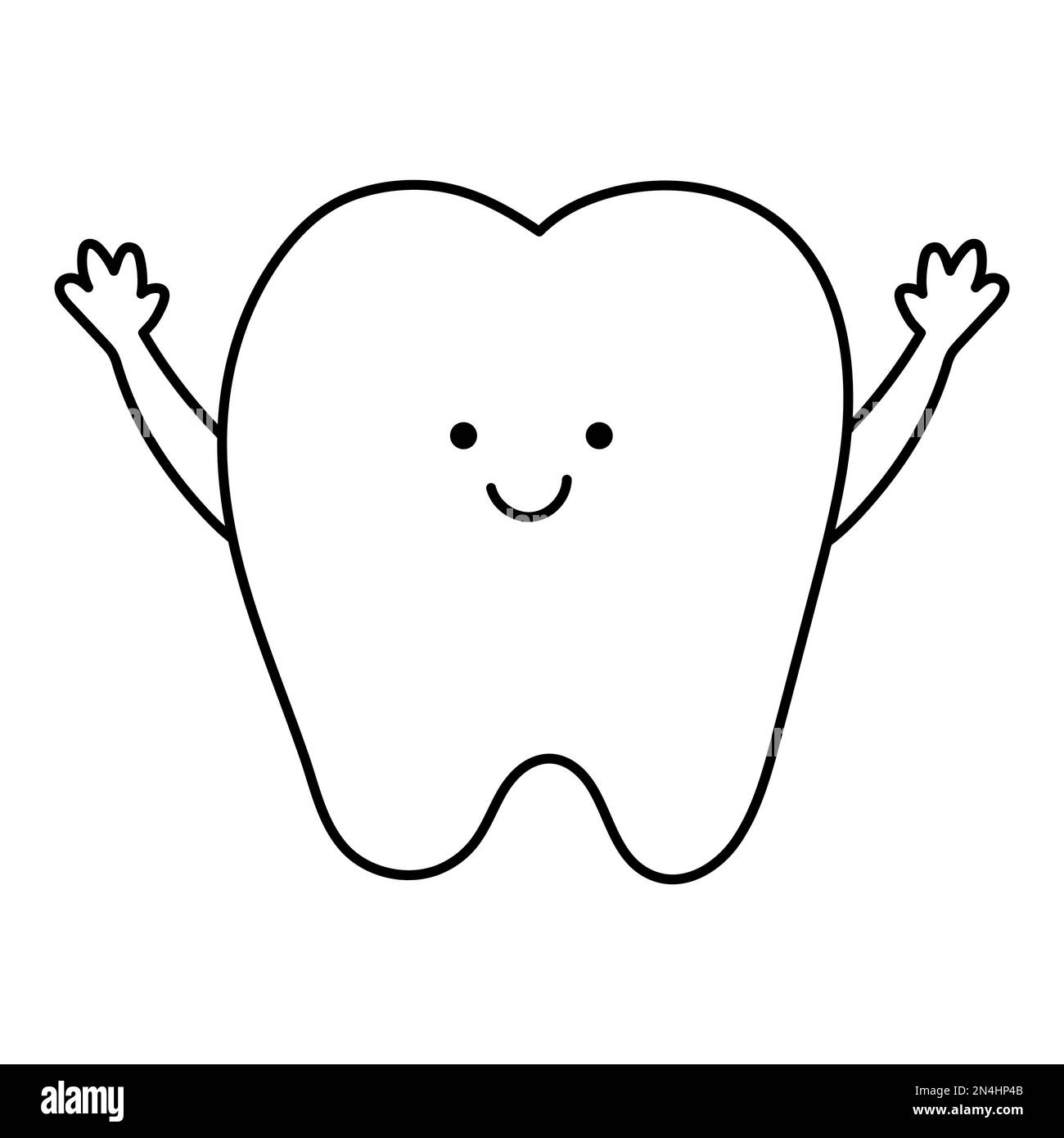Dent kawaii noire et blanche avec les mains vers le haut. Icône de la ligne des dents vectorielles. Image drôle de soins dentaires pour les enfants. Clinique de dentiste de bébé clipart