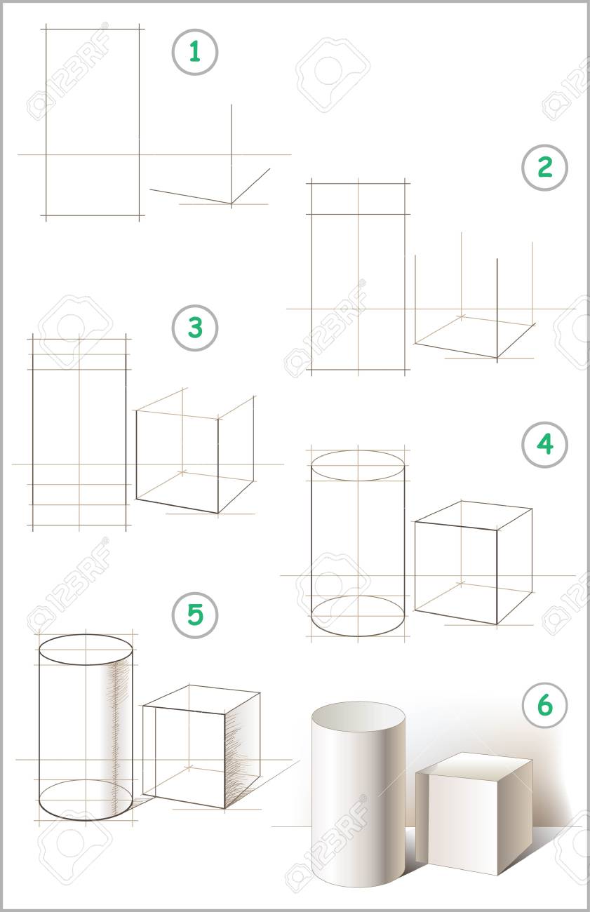 Page Montre Comment Apprendre Étape Par Étape À Dessiner Une Nature Morte Avec Un Cylindre Et Un Cube. Clip Art Libres De Droits, Svg, Vecteurs Et Illustration. Image 87875167