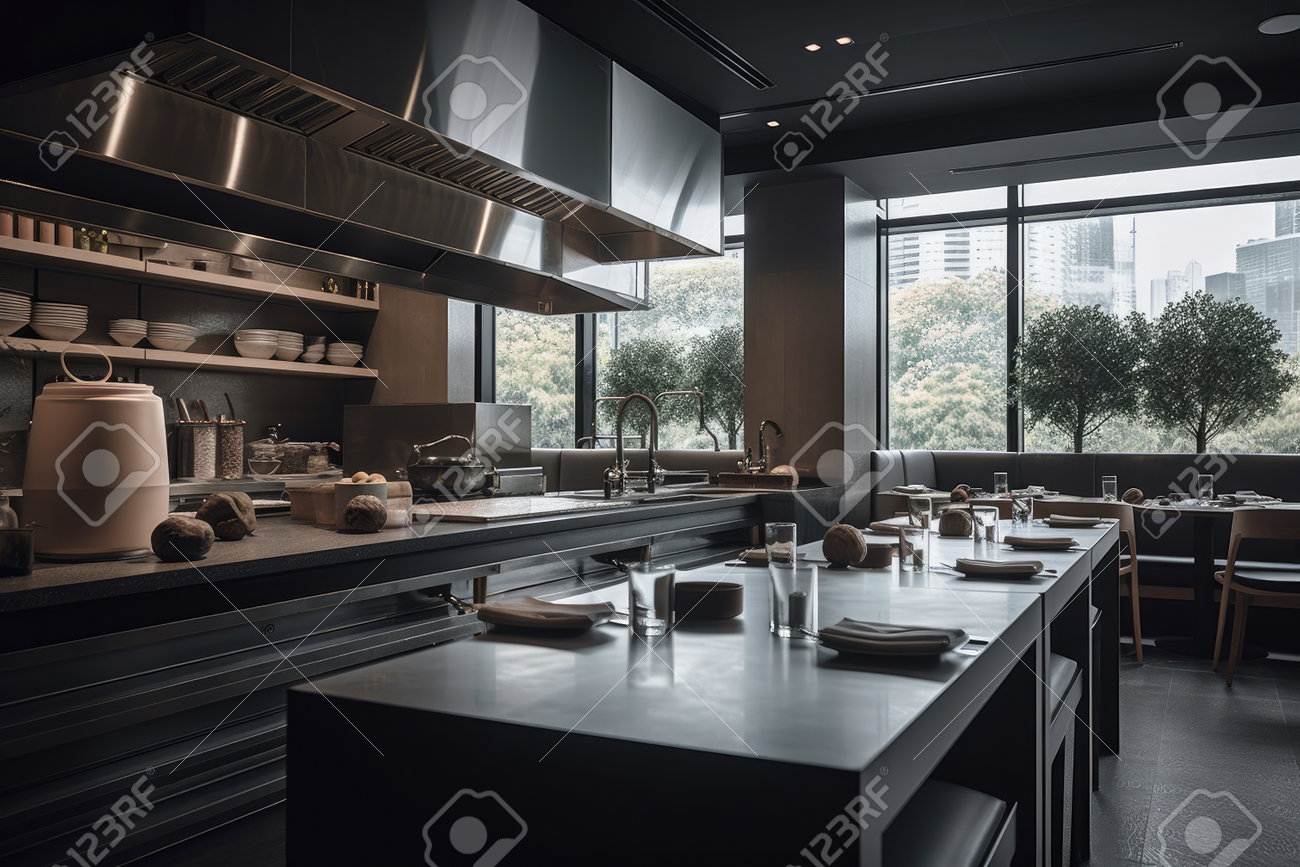 Restaurant Élégant Et Moderne Avec Vue Sur Une Cuisine Ouverte Présentant Des Pratiques Progressistes En Matière De Sécurité Alimentaire Créées Avec L'IA Générative Banque D'Images et Photos Libres De Droits. Image 203951055