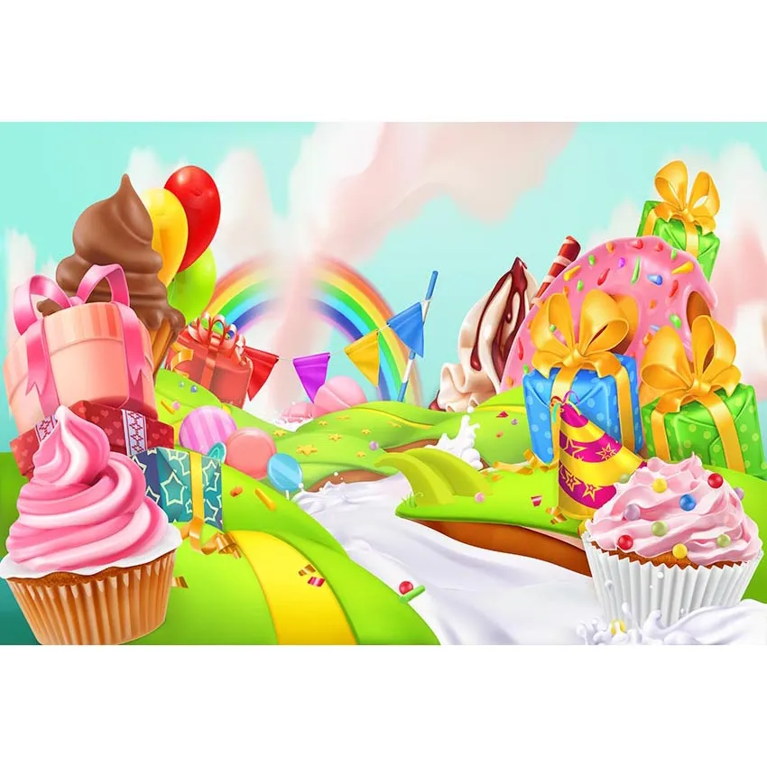 Cartoon Candy Land Backdrop Printed Present Boxes Cakes Milk River Flags Rainbow Baby Kids Birthday Party Photo Booth Background From 16,48 € | DHgate