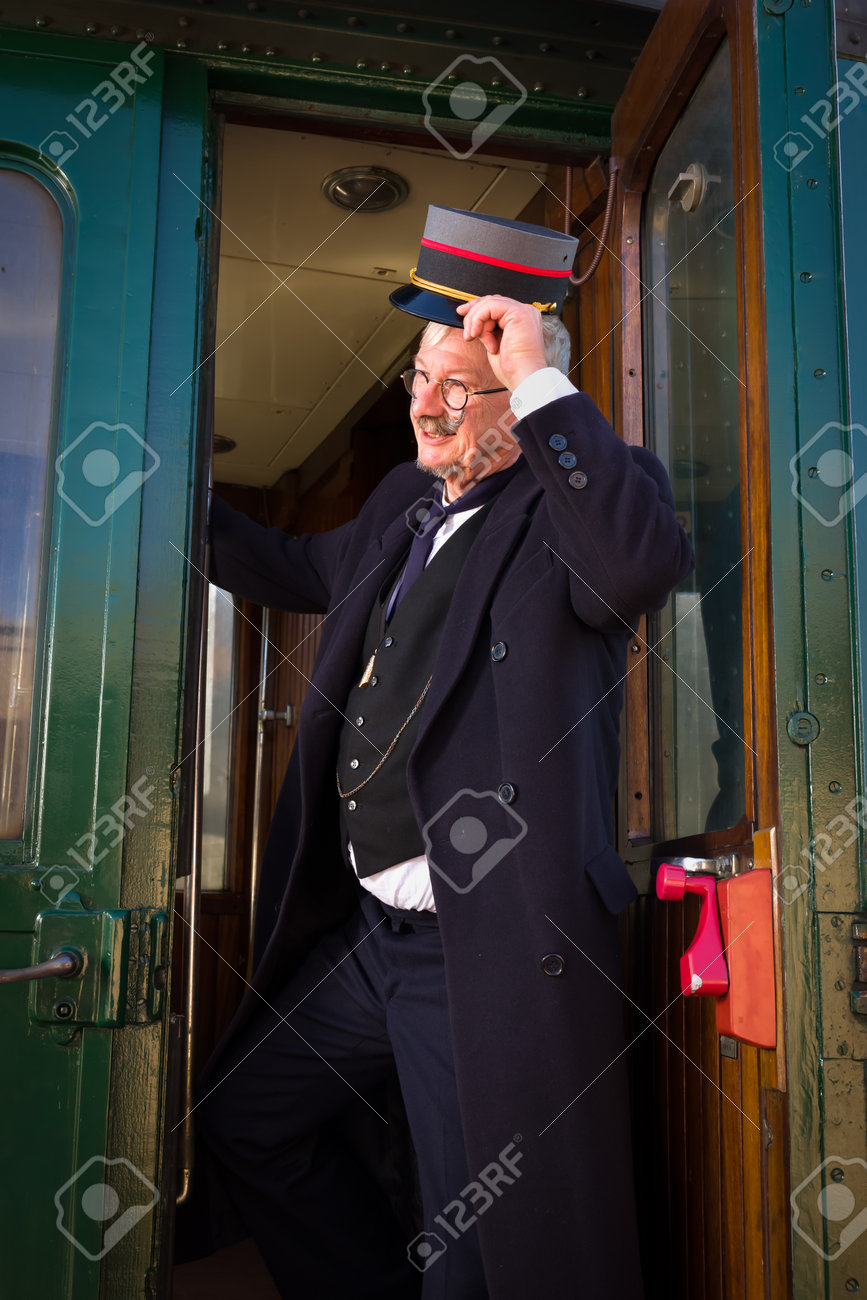 Scène De Reconstitution Avec Un Authentique Wagon De Train De 1re Classe De 1927 Et Un Conducteur De Train Rétro Au Départ Banque D'Images et Photos Libres De Droits. Image 197647532