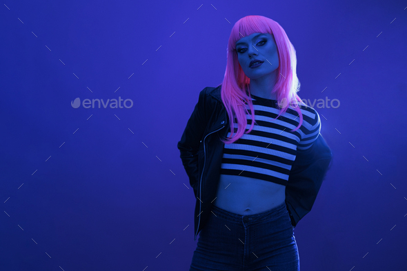 Portrait of confident woman taking pictures in violet fluorescent lighting