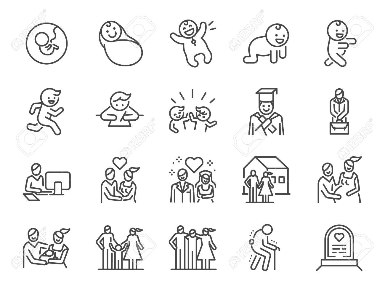 Jeu D'icônes De Ligne De Cycle De Vie. Inclus Des Icônes Comme Naissance, Enfant, Mort, Croissance, Famille, Heureux Et Plus Encore. Clip Art Libres De Droits, Svg, Vecteurs Et Illustration. Image 134469299