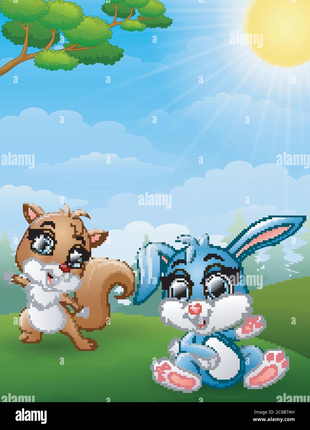 Dessin animé de bébé écureuil et de bébé lapin dans la jungle Image Vectorielle Stock - Alamy