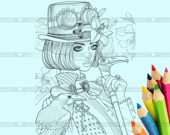 Gothique, Vampire, Corbeau, Coloriage imprimable portrait de fille, Coloriage pour adultes, Art en niveaux de gris, Steampunk, Téléchargement instantané, JPG - Etsy Canada
