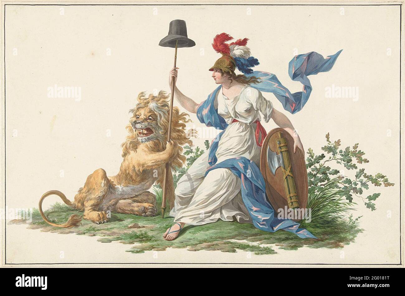 Modèle pour le drapeau de la marine Batavienne, 1796. Dessin pour le logo allégorique ajouté au drapeau marin de la République de Batavia dans le coin supérieur gauche du drapeau existant de