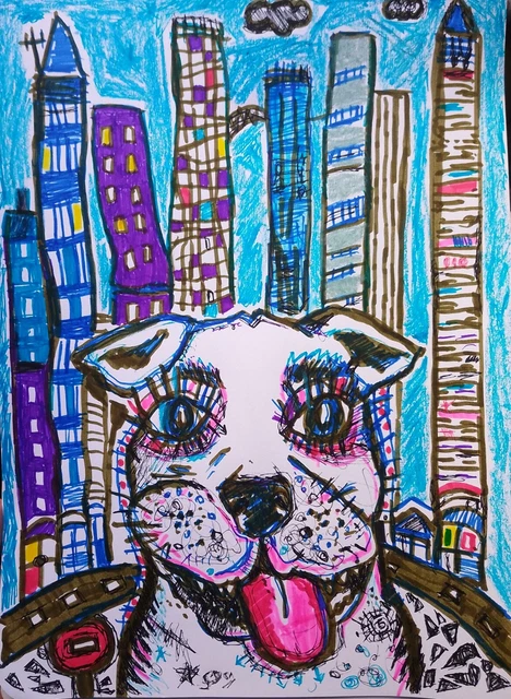 TABLEAU CHIEN PITBULL American Pit Bull terrier ville 21x29cm/feuille signé EUR 12,00 - PicClick FR
