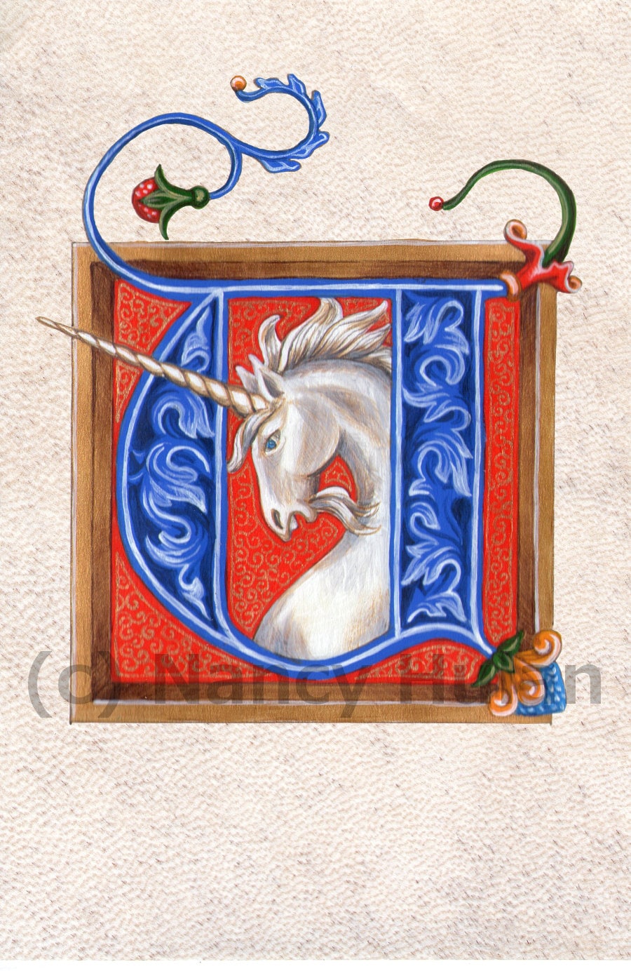 Lettre illuminée médiévale U, lettre d’alphabet U, U peinte, alphabet médiéval, lettre médiévale, impression d’art de lettre de renaissance