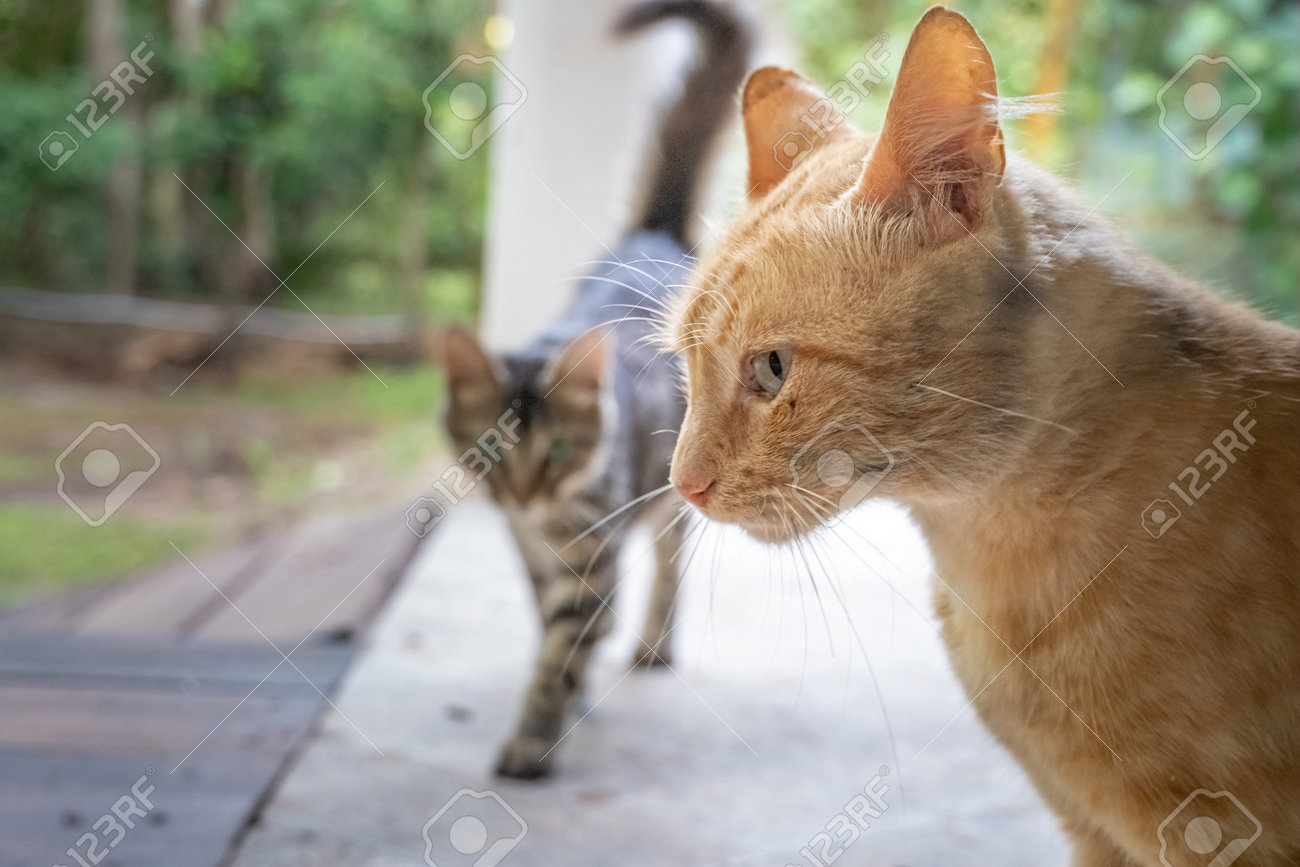 Deux Chats Qui Jouent : Un Chat Orange Est Assis Sur Le Côté, Tandis Qu'un Chat Tigré Se Cache Derrière - Accueil Chats Jouant Dans Le Jardin Banque D'Images et Photos Libres