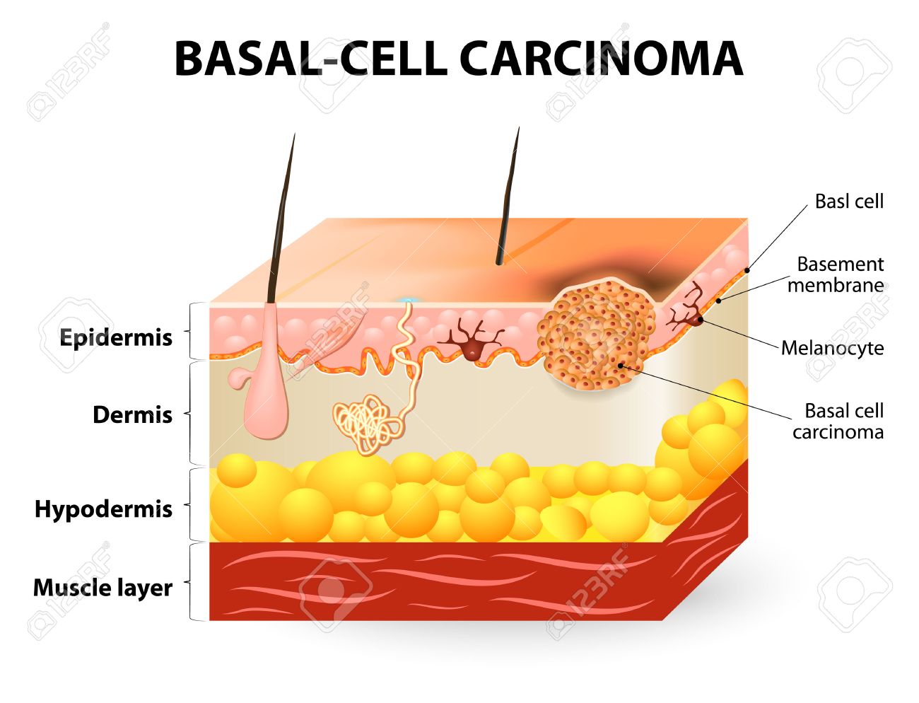 Cancer De La Peau. Le Carcinome Baso-cellulaire Ou Carcinome Basocellulaire (BCC). Représentation Schématique De La Peau. Les Mélanocytes Sont Également Présents Et Servent De Source De La Cellule De Mélanome. La Séparation