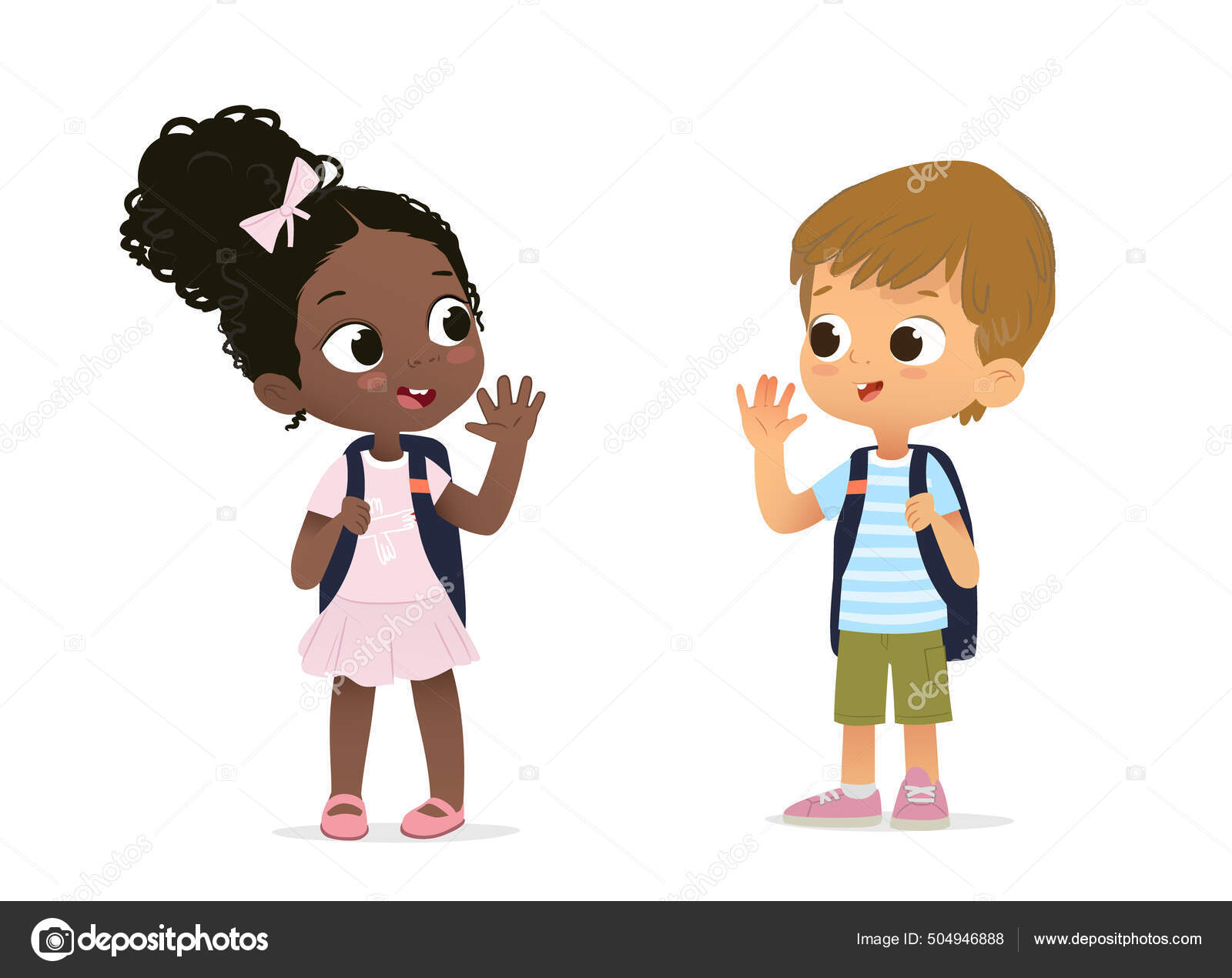 Fille afro-américaine avec le sac à dos disant au revoir au garçon caucasien. Heureux camarades