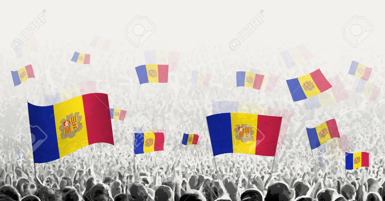 Foule Abstraite Avec Le Drapeau Des Peuples D'Andorre Protestant Contre La Grève Révolutionnaire Et Manifestation Avec Le Drapeau De L'illustration Vectorielle D'Andorre Clip Art Libres De Droits, Svg, Vecteurs Et Illustration. Image