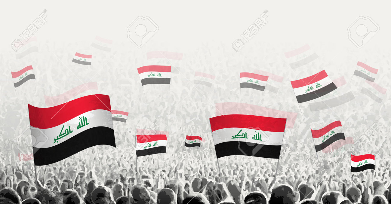 Foule Abstraite Avec Le Drapeau Des Peuples Irakiens Protestant Contre La Grève Révolutionnaire Et Manifestation Avec Le Drapeau De L'illustration Vectorielle Irakienne Clip Art Libres De Droits, Svg, Vecteurs Et Illustration. Image