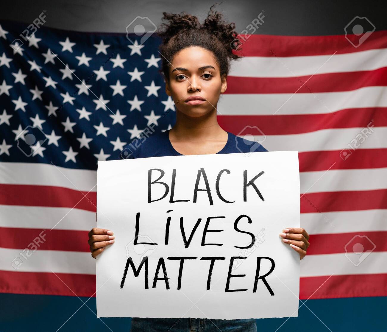 Non Au Racisme. Fille Noire Protestant Avec L'affiche Black Lives Matter, Fond De Drapeau Américain Banque D'Images et Photos Libres De Droits. Image 150462432
