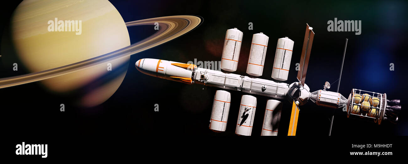 Vaisseau spatial sur une mission à la planète Saturne, l'anneau en orbite d'un vaisseau géant gazeux (science-fiction 3D render banner, éléments de cette image sont é Photo Stock - Alamy