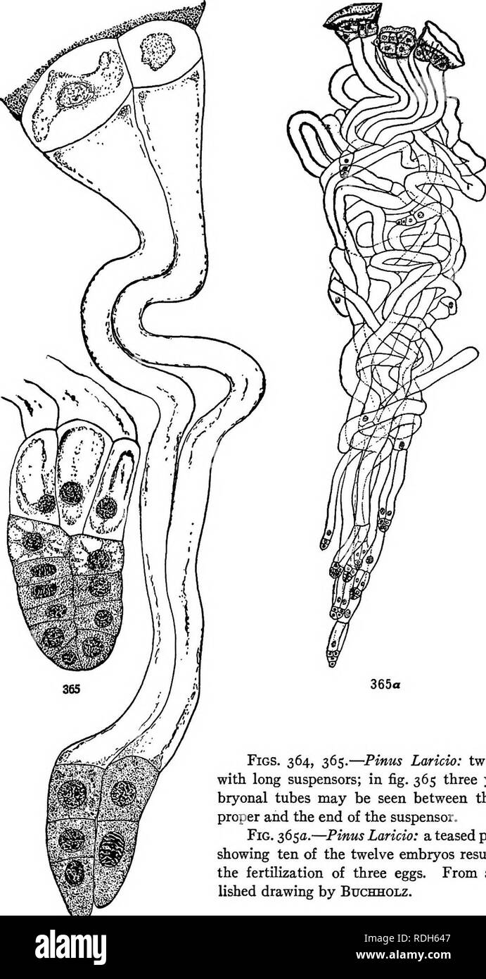 Morphologie des gymnospermes. Les gymnospermes ; la morphologie des plantes. 296 Morphologie des gymnospermes. Fig. 364, 365.-Pinus laricio : deux embryons avec suspenseurs longtemps ; à la fig. 365 trois jeunes