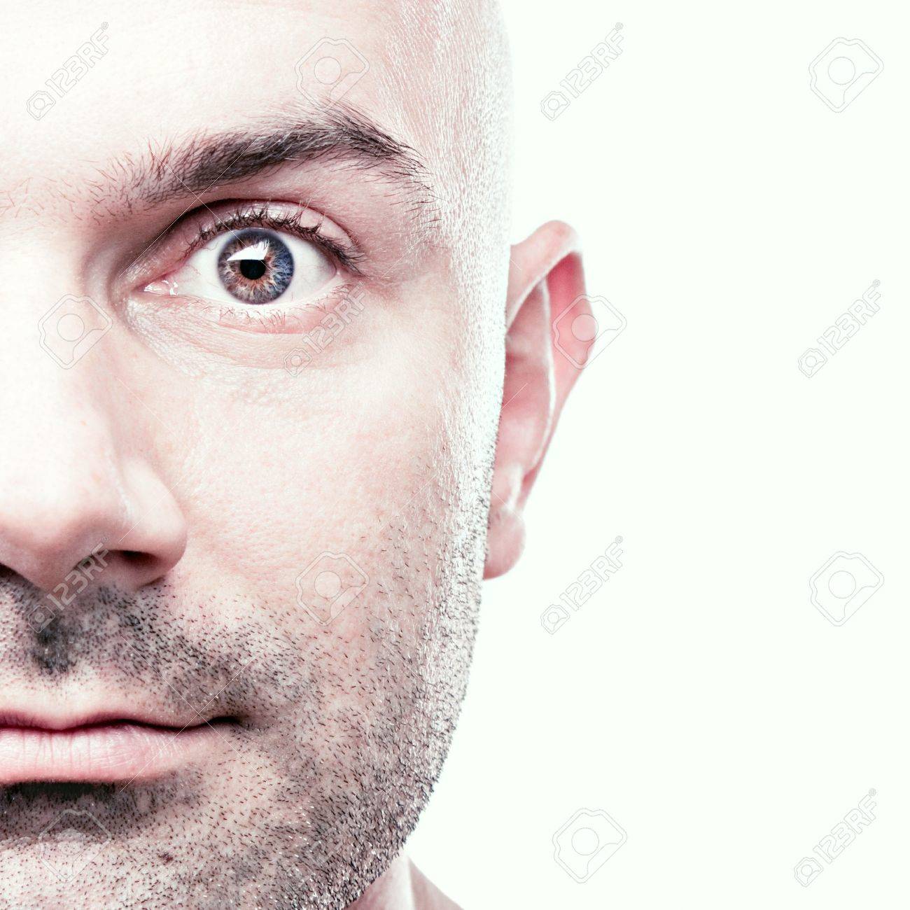 Close-up Homme Mûr Aux Yeux De Braise Qui Envisagent Grande Idée Vient À L' esprit. Visage Surpris Objet Est Isolé Sur Fond Blanc. Banque D'Images et Photos Libres De Droits. Image 15981503