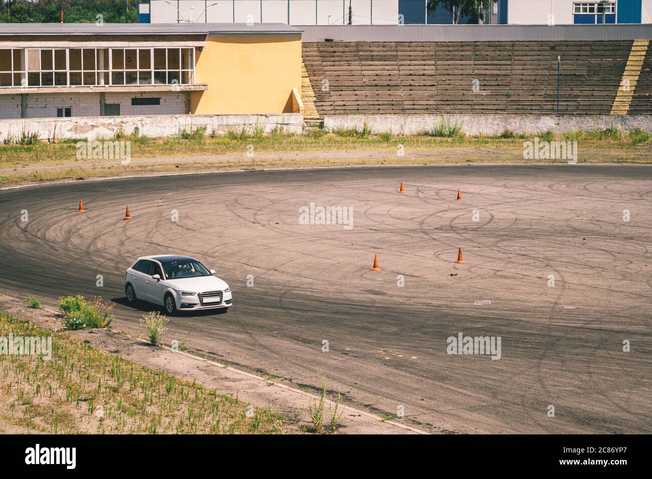 Voiture et cônes de circulation, concept d'école de conduite. La voiture d'entraînement effectue des exercices sur le terrain d'entraînement de l'école de conduite. Stade pour une conduite sûre Photo Stock - Alamy