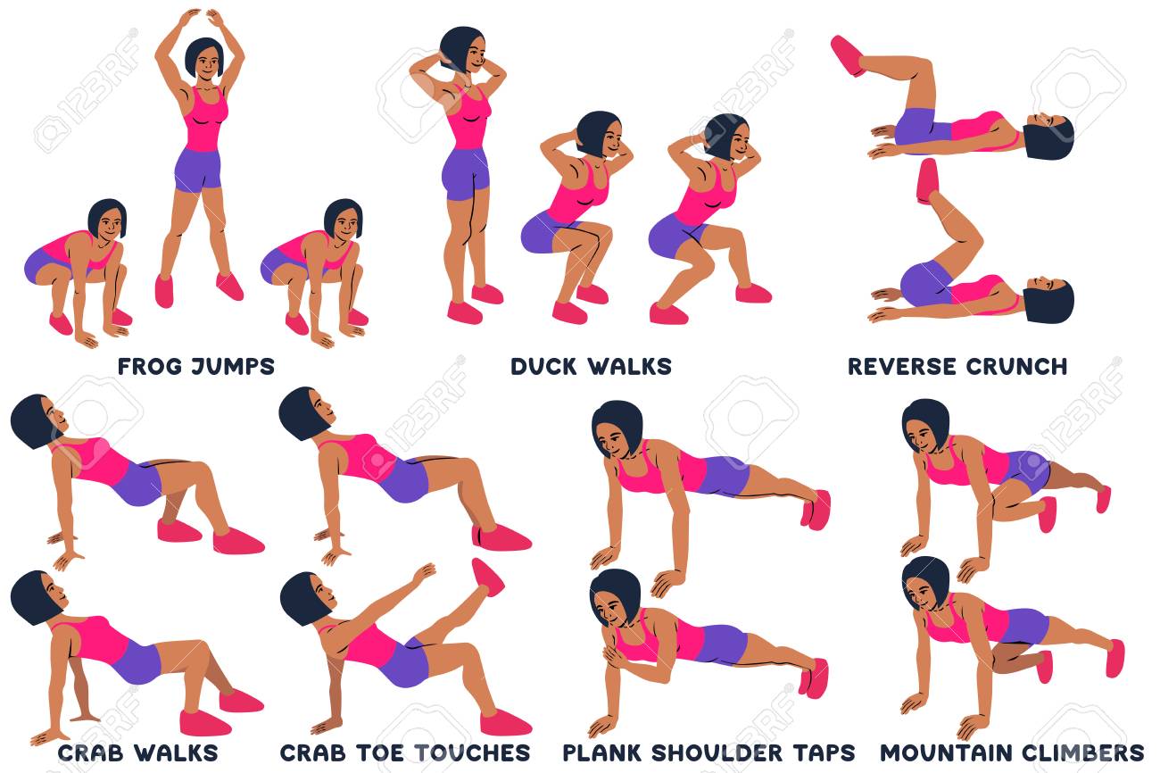 La Grenouille Saute. Canard Se Promène. Crunch Inversé. Le Crabe Se Promène. L'orteil De Crabe Touche. Robinets D'épaule En Planche. Alpinistes. Exercices Sportifs. Silhouettes De Femme Faisant De L'exercice. Entraînement, Formation Illustration
