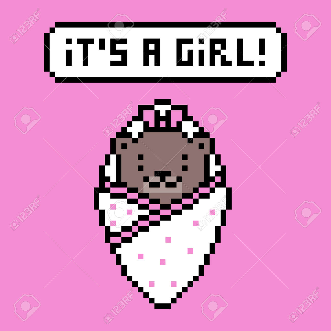 Pixel Art 8 Bits C'est Une Impression De Citation De Fille. Petit Ours Nouveau-né Dans Un Sac De Couchage Sur Fond Rose. Conception De Carte De Voeux De Douche De Bébé. Message