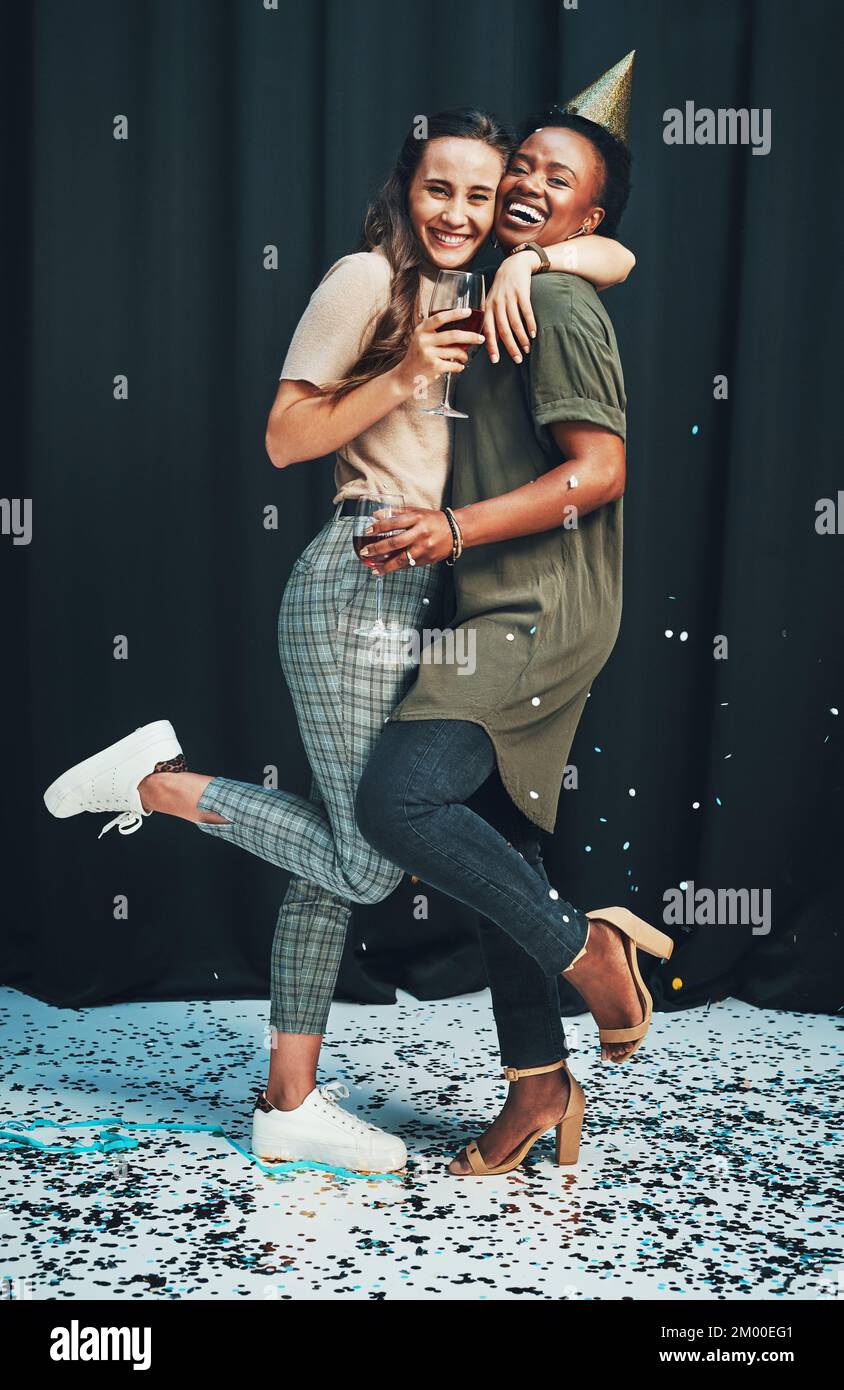 Amis, portrait et câlin à la fête de la Saint-Sylvestre avec des ...