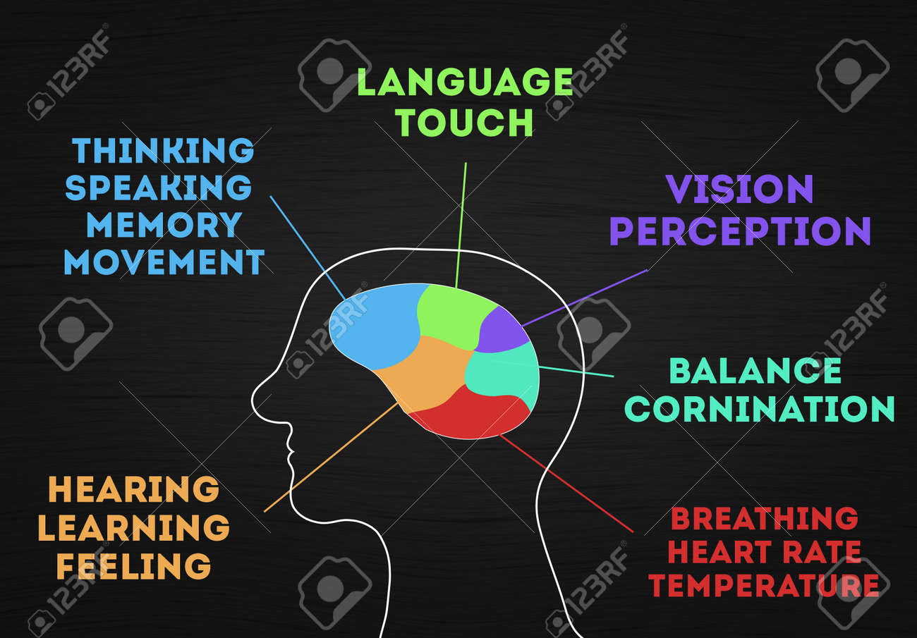 Fonctions Et Parties Du Cerveau Humain. Infographie De La Fonction Mentale De L'homme. Silhouette De Tête D'homme Avec Une Partie Graphique Colorée Du Cervelet, Arrière-plan Chalkboeard Banque D'Images et Photos Libres De