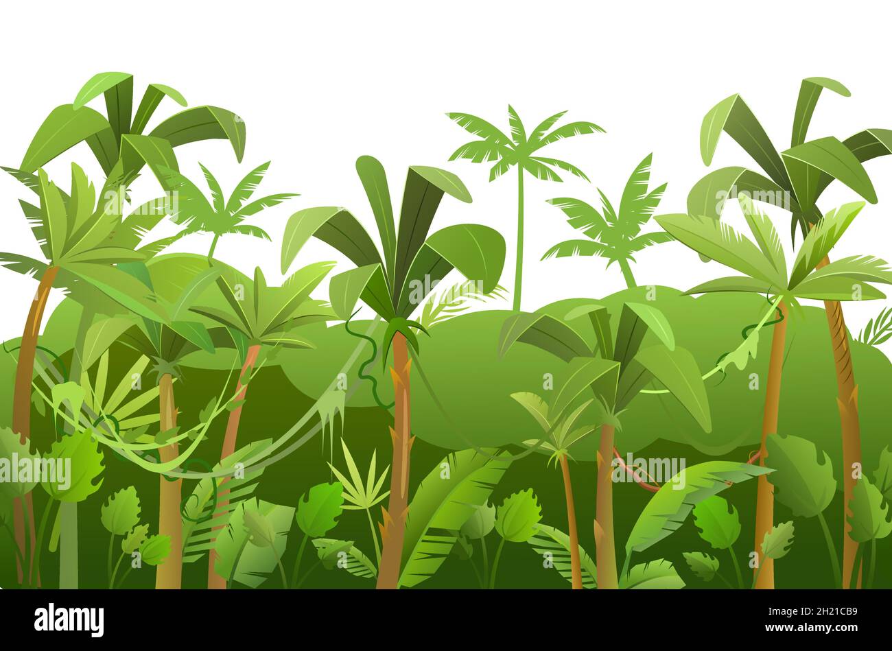 Fond de jungle.Plantes de la forêt tropicale.Magnifique paysage vert avec arbres exotiques et palmiers.Herbe et lianes.Joli dessin animé.Isolé sur blanc Image Vectorielle Stock - Alamy