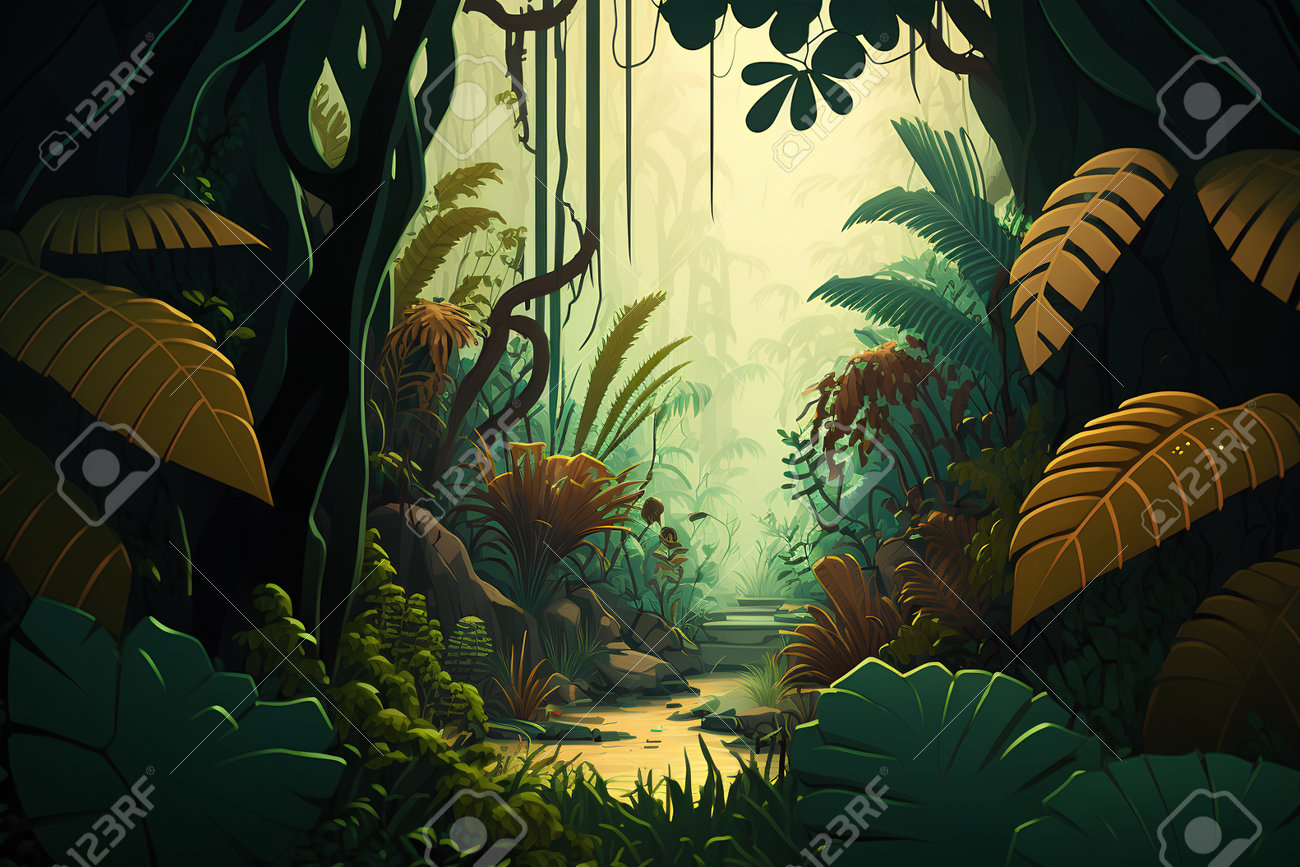 Donnez-moi à la jungle un fond de dessin animé de jungle dangereuse et verte - SeaArt AI