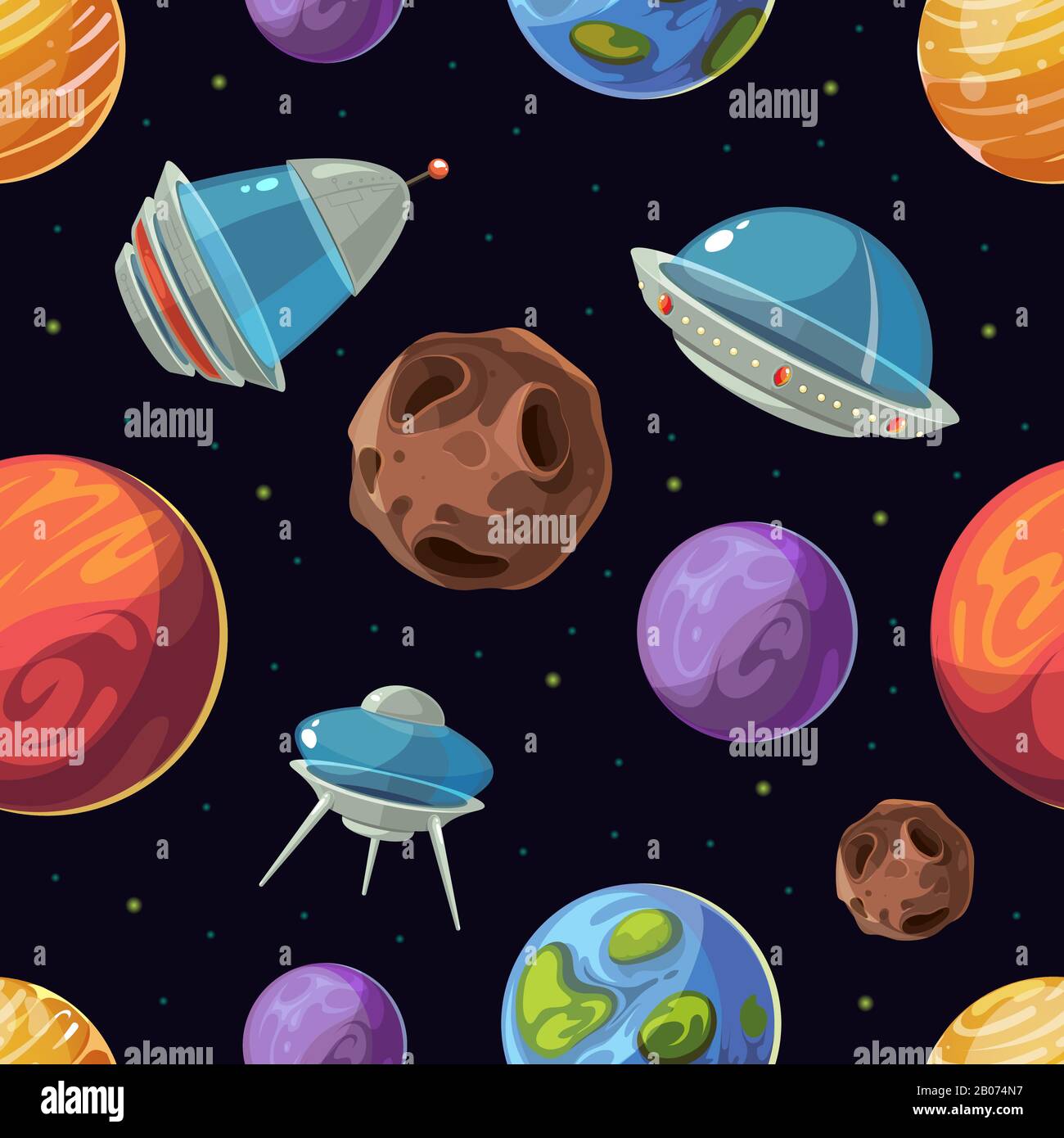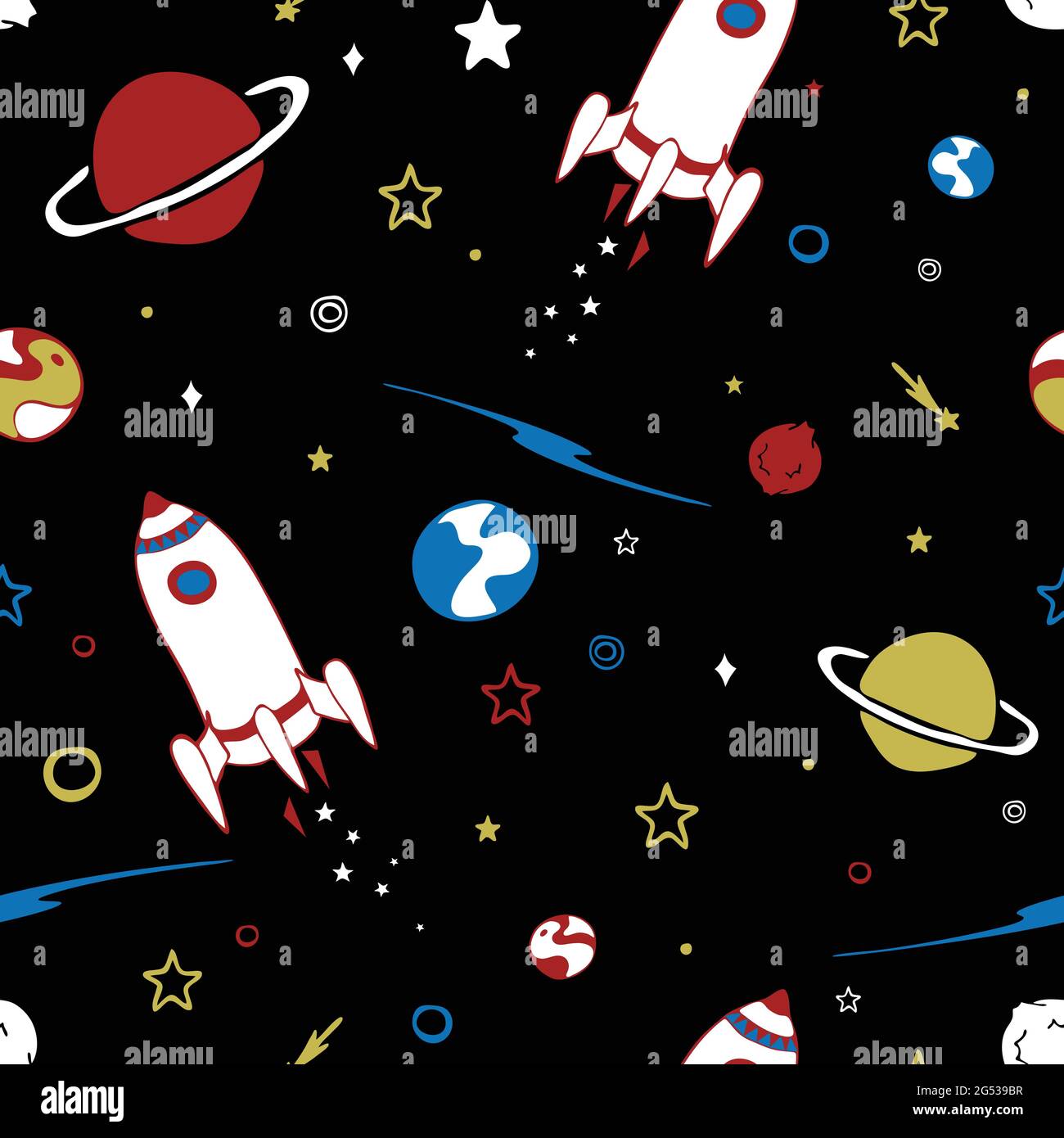 Motif vectoriel transparent avec vaisseau spatial et planètes sur fond noir. Papier peint galaxie simple pour les enfants. Dessin animé roquette textile de mode Image Vectorielle Stock - Alamy