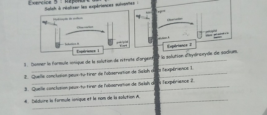 SOLVED: Salah d? réaliser les expériences suivantes : Experience 1 1. Donner la formule ionique de la solution de nitrate d'argent 2. Quelle conclusion peux-tu-tirer de l'observation de Salah o 3. Quelle
