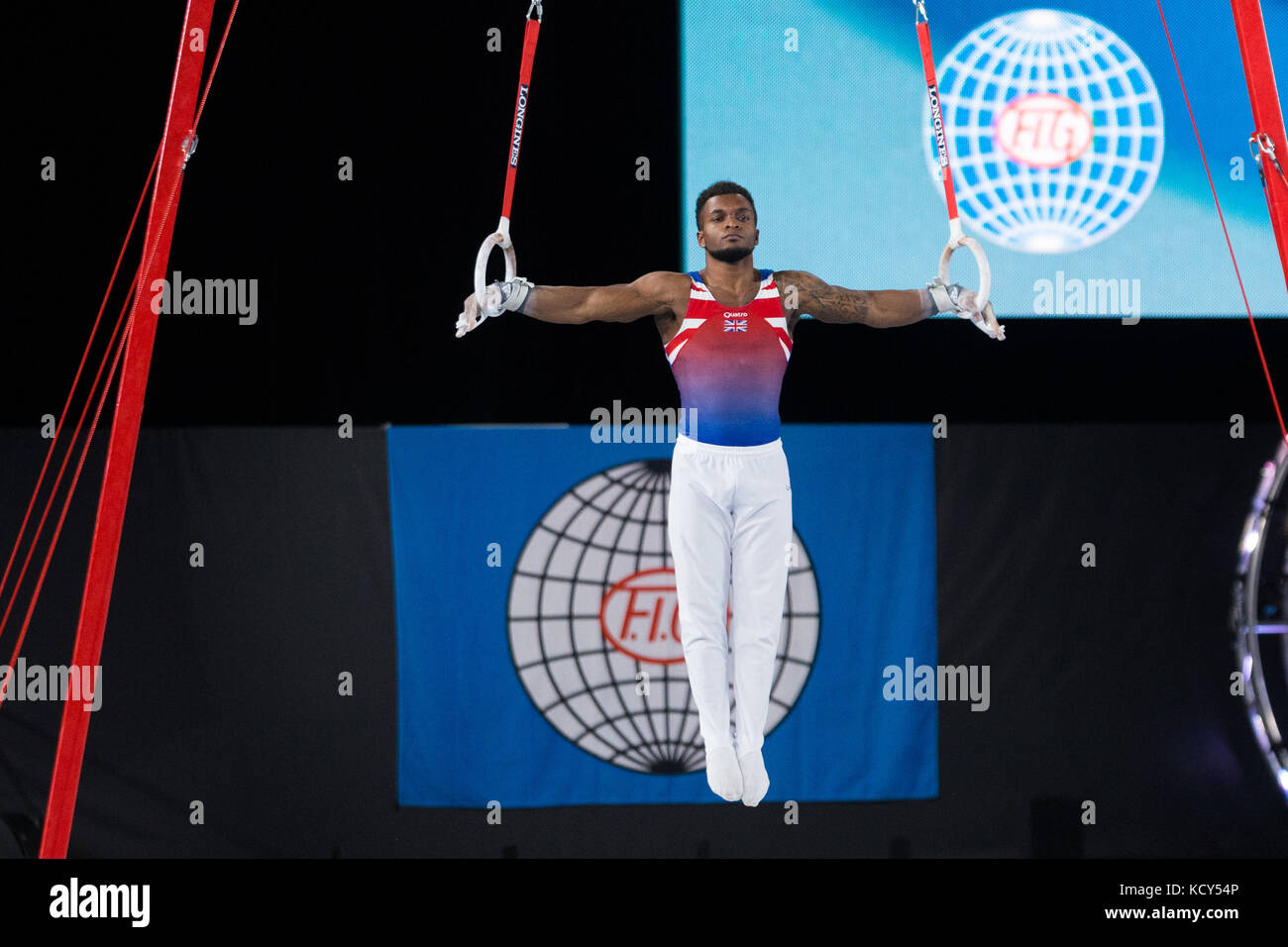 Montréal, Canada. 07Th Oct, 2017. Courtney Tulloch de Grande-Bretagne (193) effectue la croix de fer sur les anneaux pendant l'appareil finales de la Championnats du Monde de Gymnastique artistique 2017 au Stade