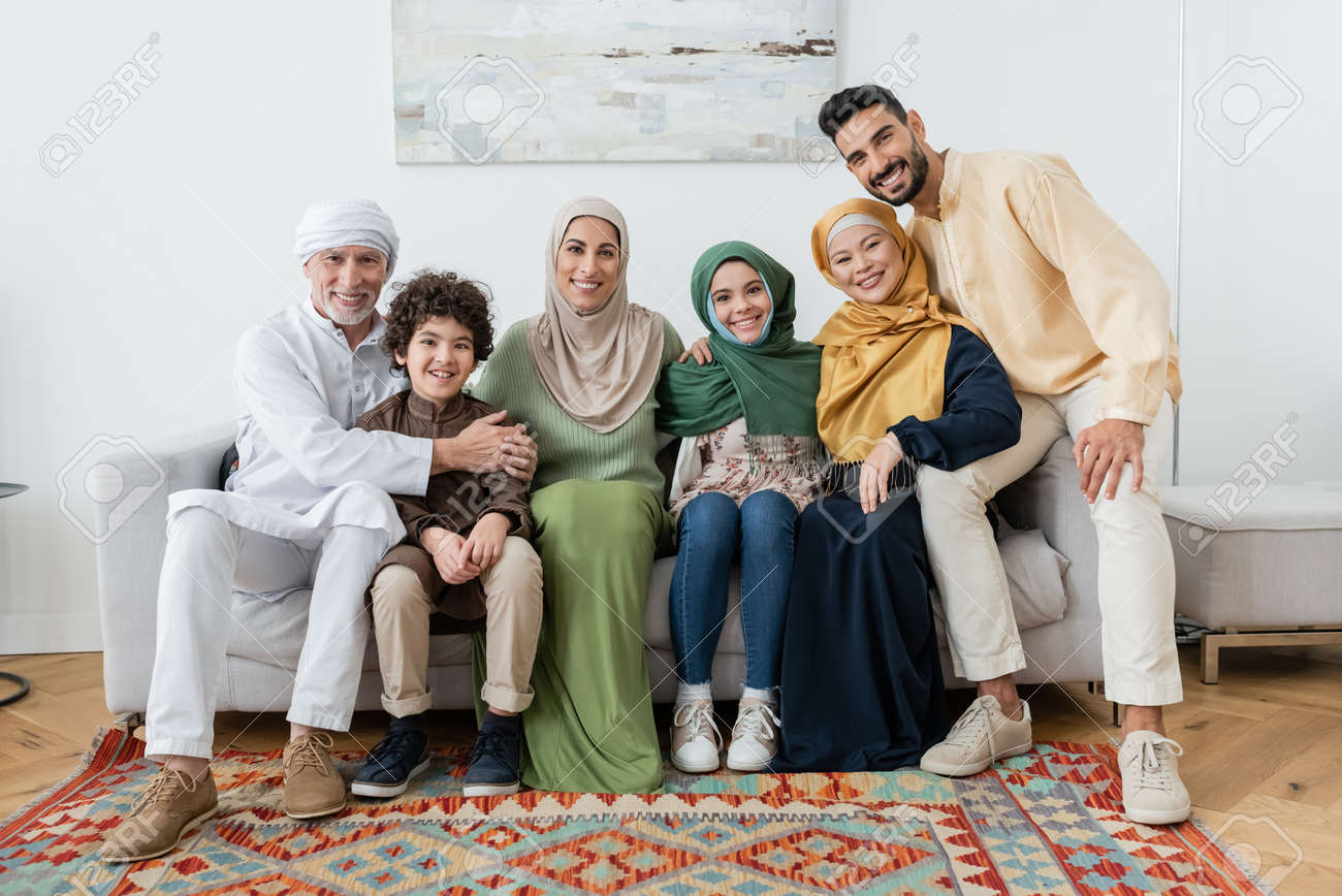 Heureuse Famille Musulmane Multiethnique Regardant La Caméra Sur Le Canapé À La Maison Banque D'Images et Photos Libres De Droits. Image 180661856