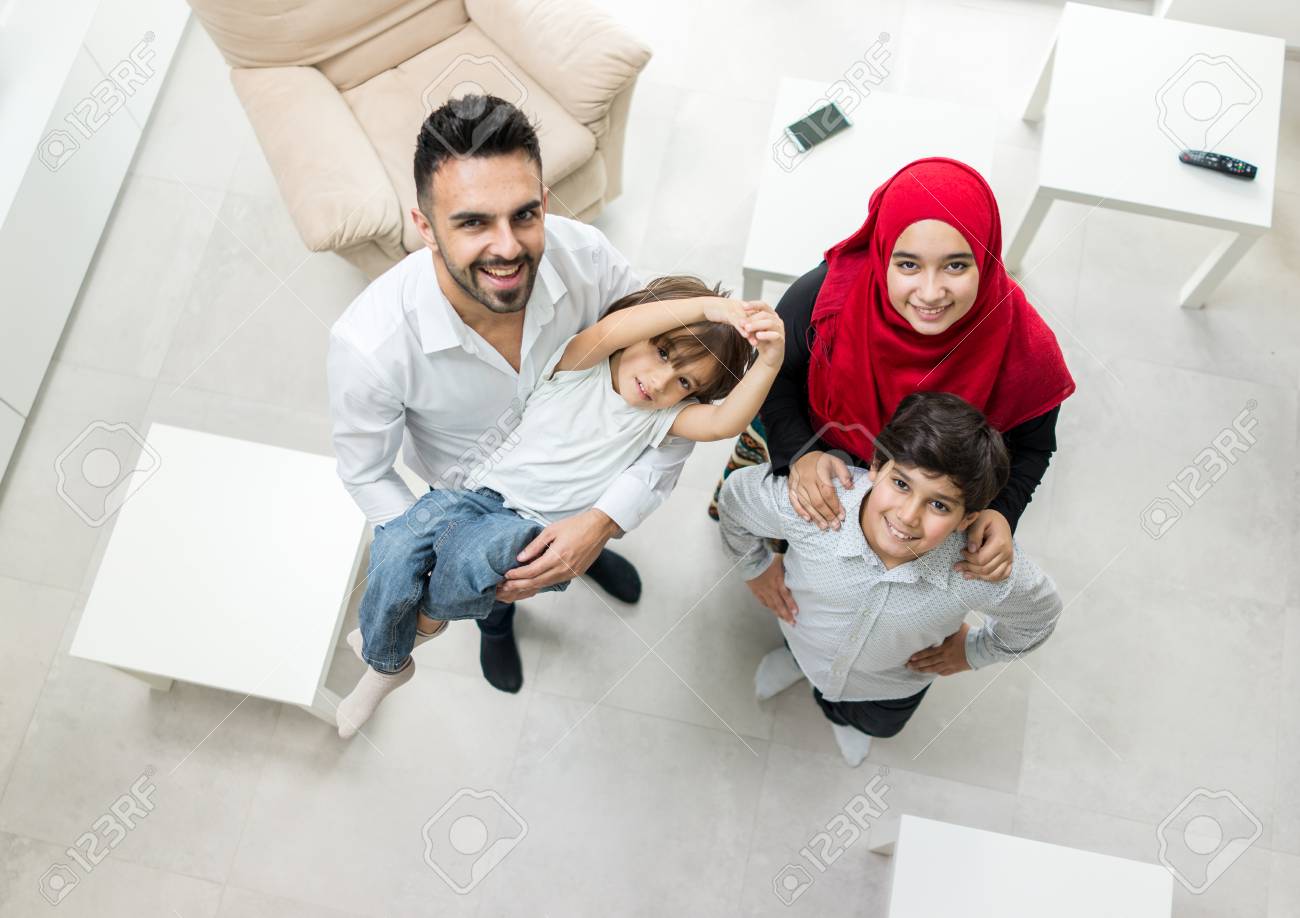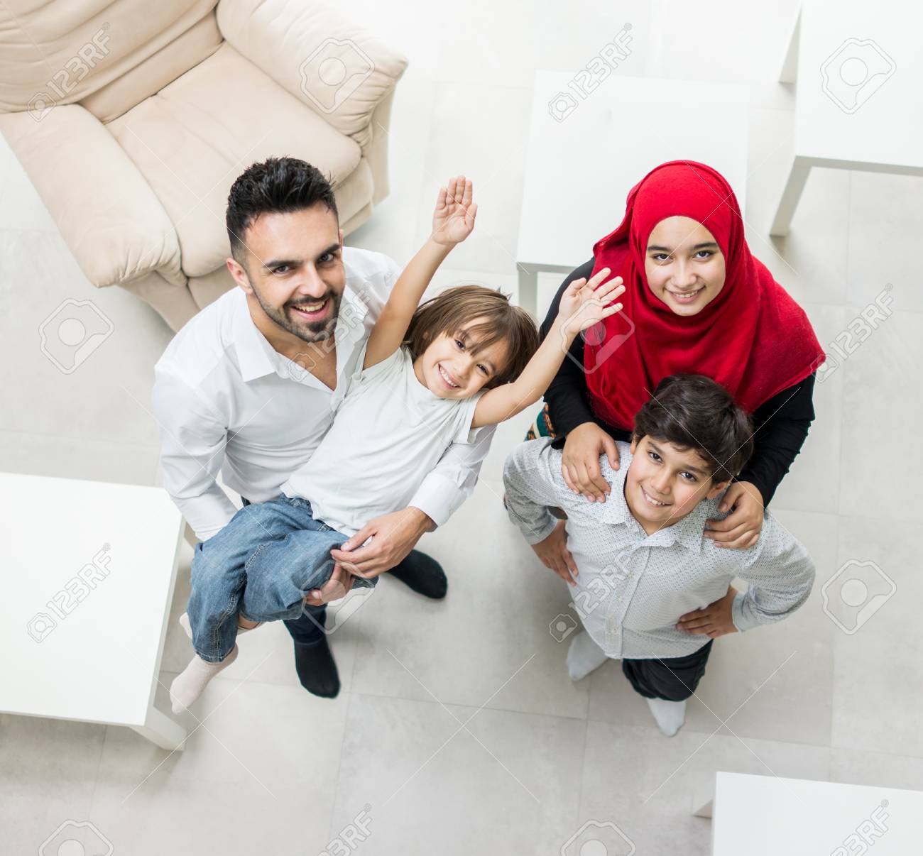 Vue De L'angle Élevé De La Famille Musulmane Arabe Heureuse À La Nouvelle Maison Moderne Banque D'Images et Photos Libres De Droits. Image 78054883