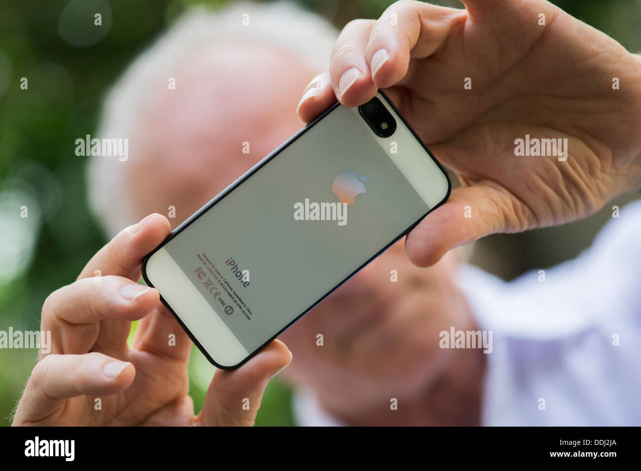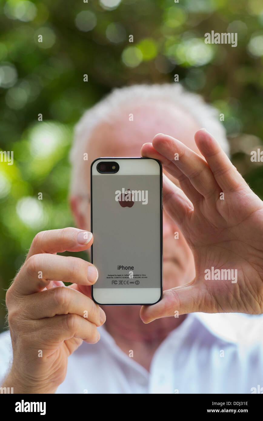 Senior man taking a photo with an Apple iphone 5 Stock Photo - Alamy
