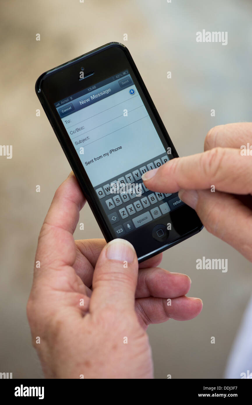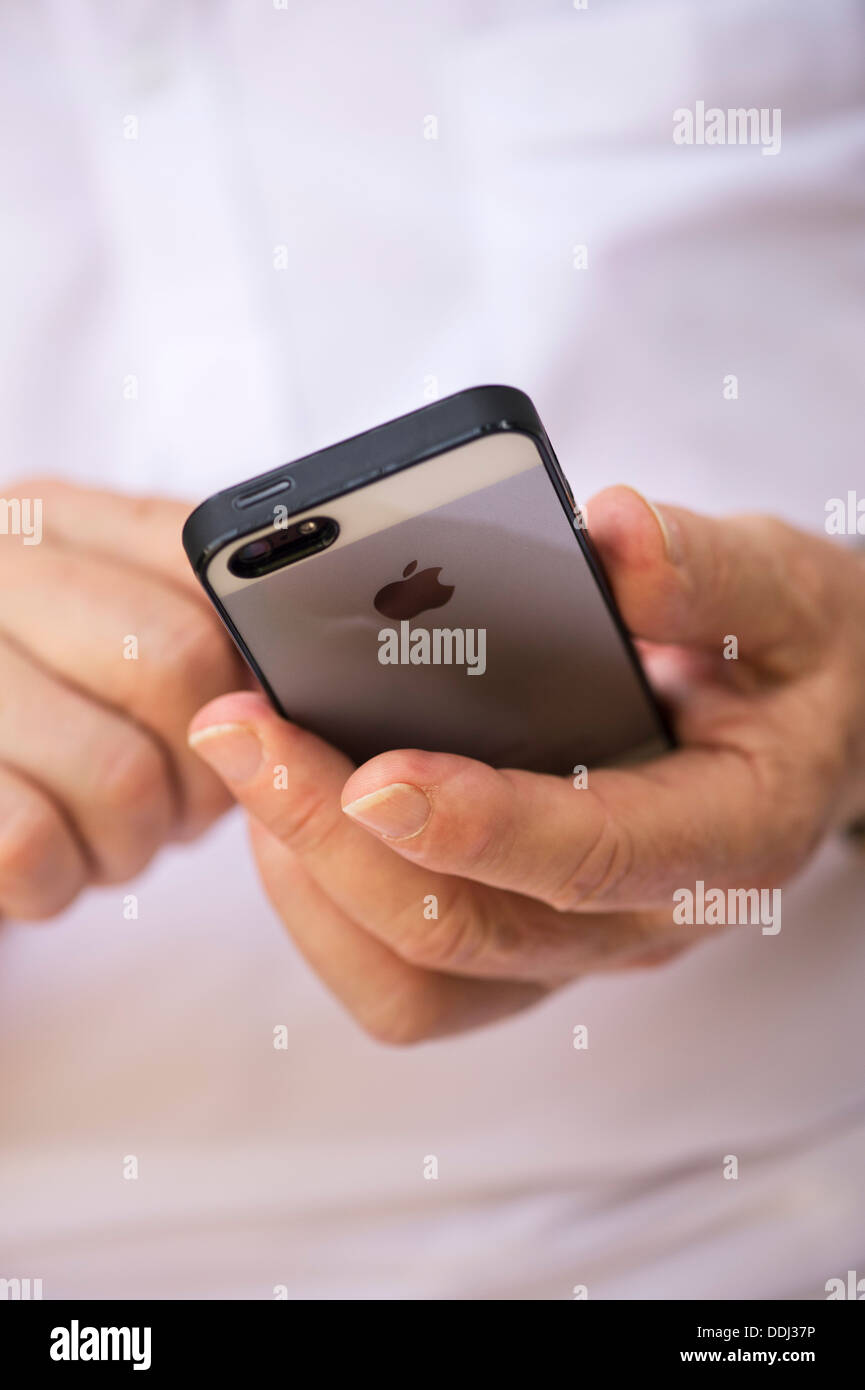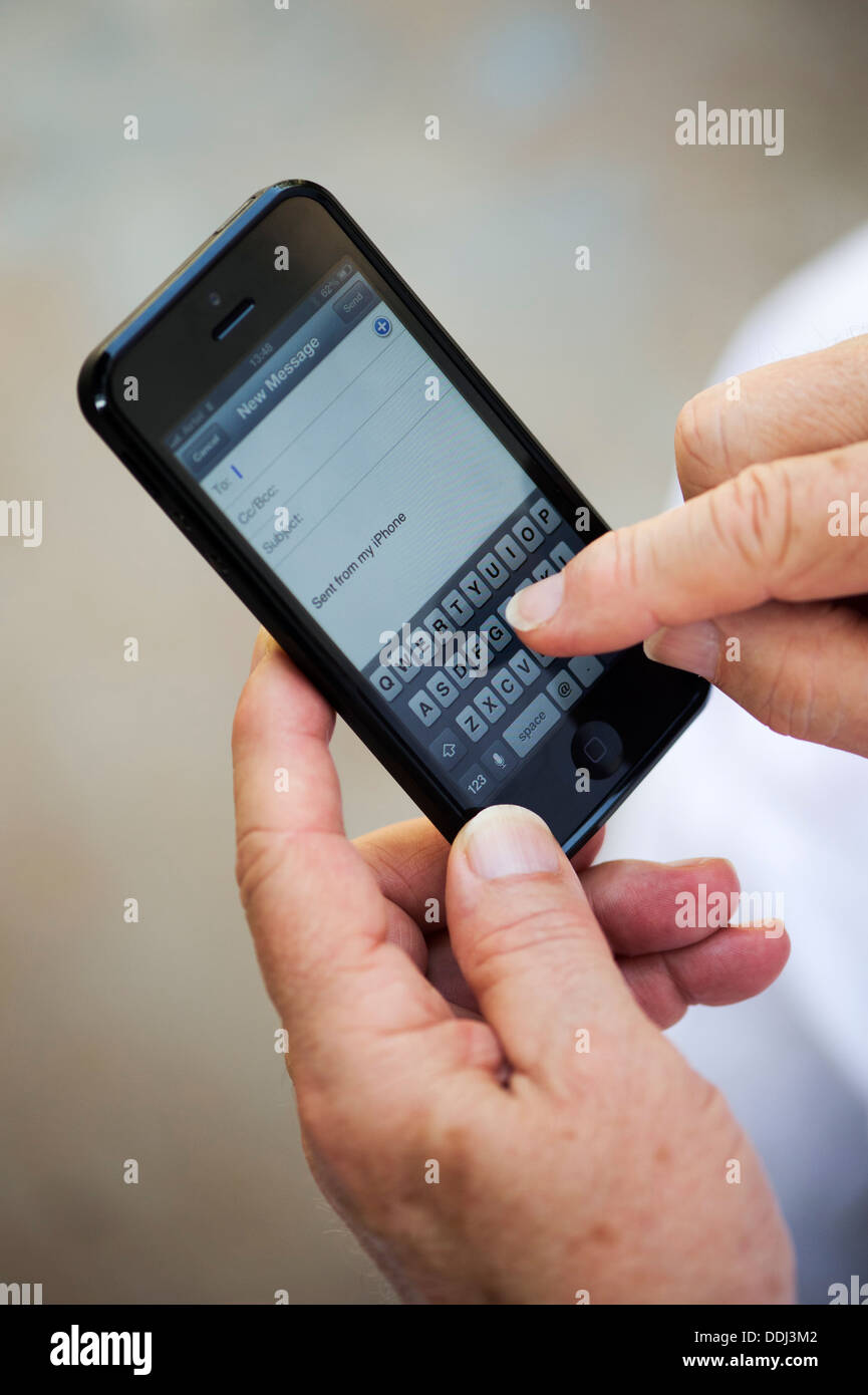 Senior Apple iphone 5 pour écrire des mails Photo Stock - Alamy