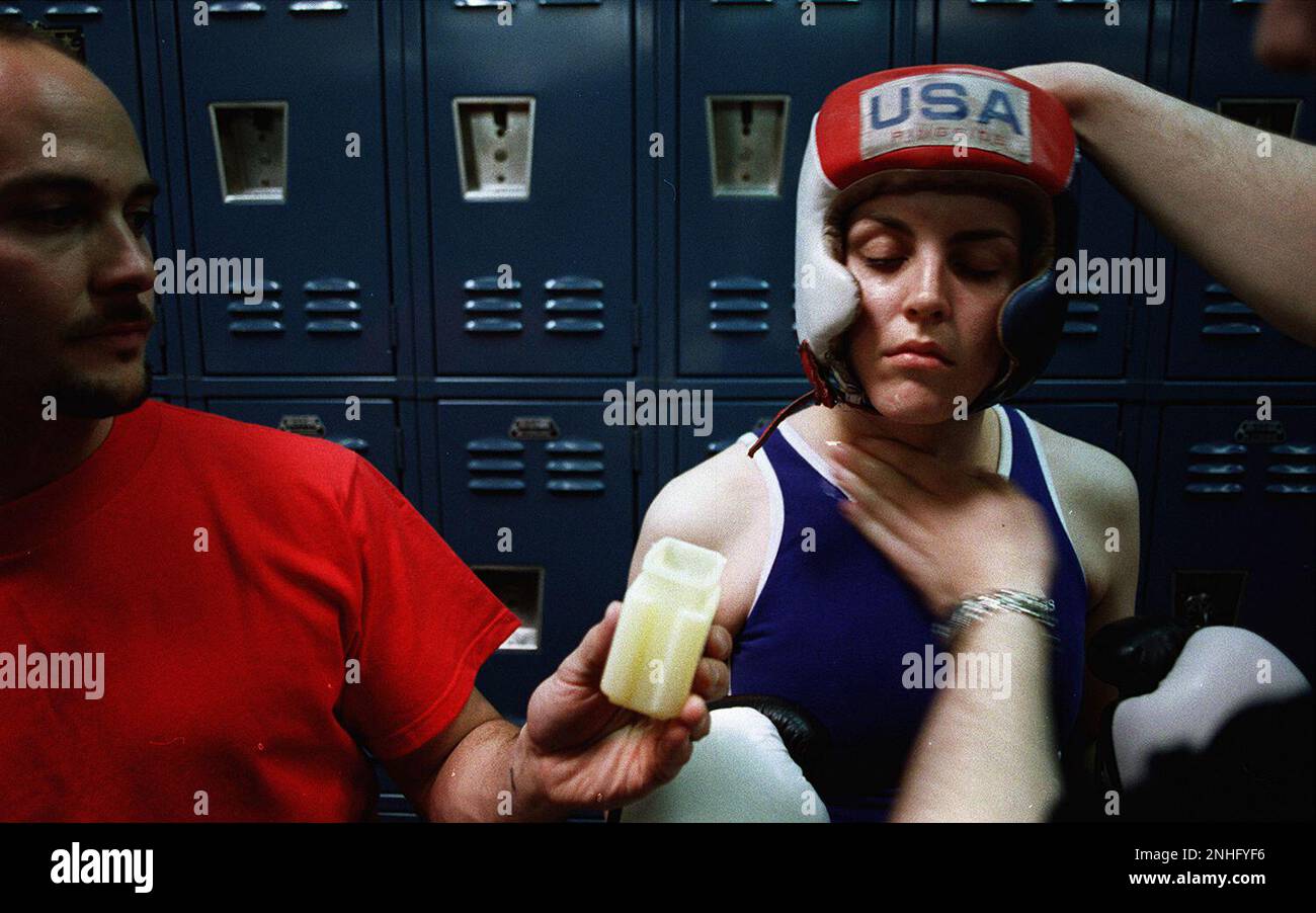 BOXER RUB/C/03JUN98/MN/MAC Female boxer Jennifer Martin trains for her first amatuer boxing match. Martin has her face rubbed with vaseline minutes before the start of the match. By Michael Macor/The Chronicle (MICHAEL